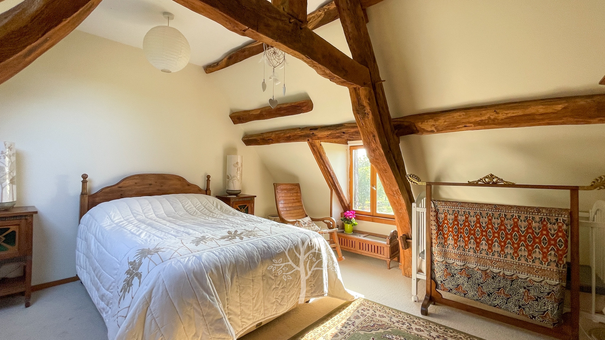 Côté Ouest, la porte d’entrée ouvre sur un petit appartement composé d’une pièce à vivre avec un coin cuisine qui s’ouvre sur une terrasse en bois, un bureau et un escalier qui mène à une chambre et une salle de bains. Côté Est, une autre entrée ouvre sur un grand séjour avec une belle cheminée et son poêle à bois, puis une grande cuisine avec une autre cheminée, une grande véranda, deux chambres et deux salles d’eau. L’escalier mène à la mezzanine et aux deux autres chambres avec salles d’eau en suite.
