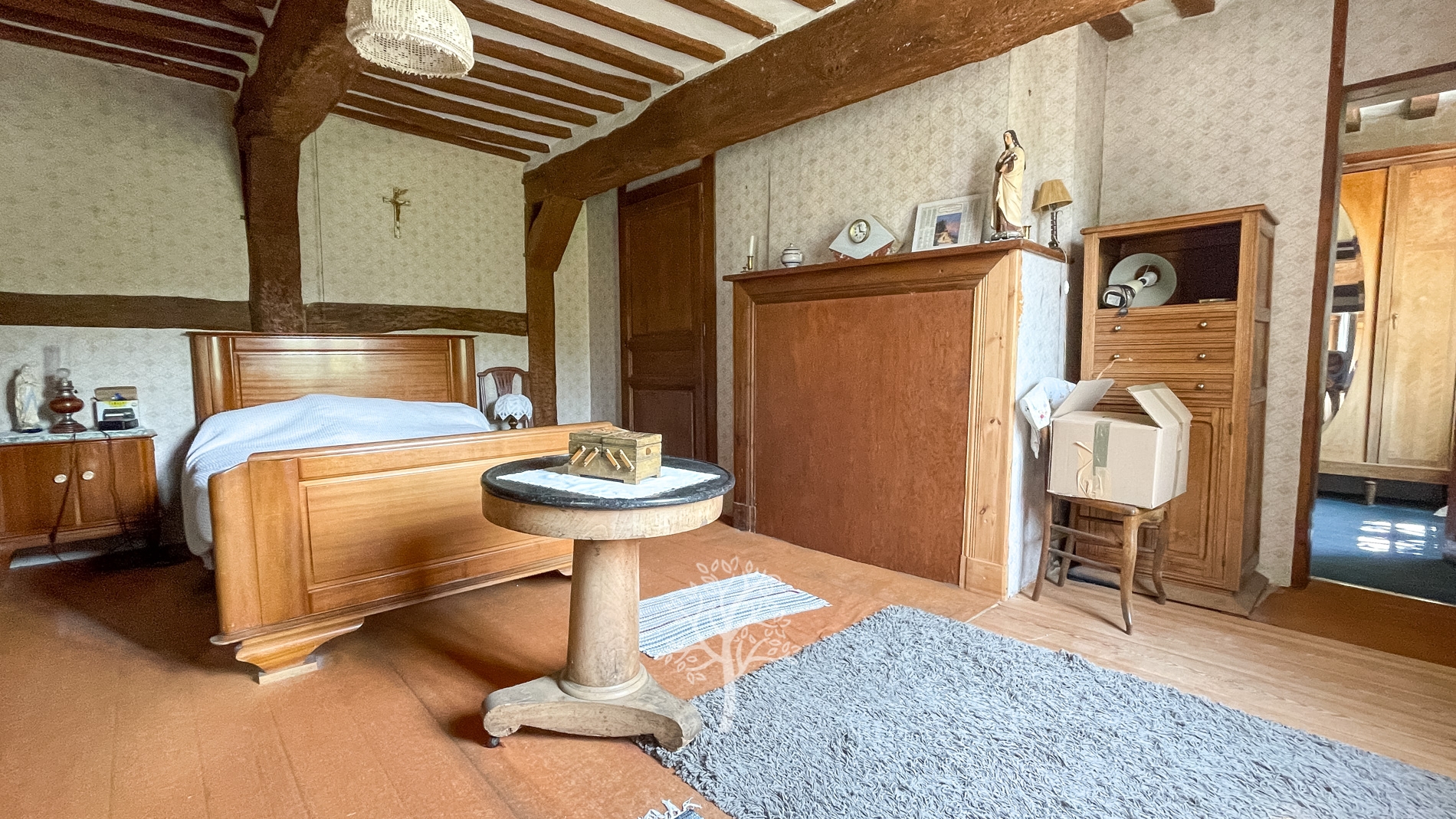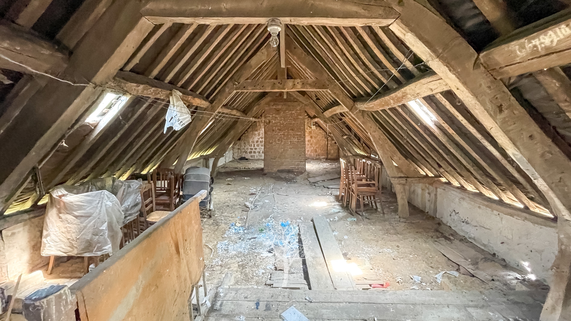 La maison principale, répartie sur trois niveaux, comprend une cuisine, une salle à manger spacieuse agrémentée d'une imposante cheminée, ainsi qu'un salon. À l'étage, vous trouverez trois chambres lumineuses et une salle de douche. De plus, le grenier aménageable offre la possibilité d'ajouter des chambres supplémentaires, selon vos besoins et votre créativité.