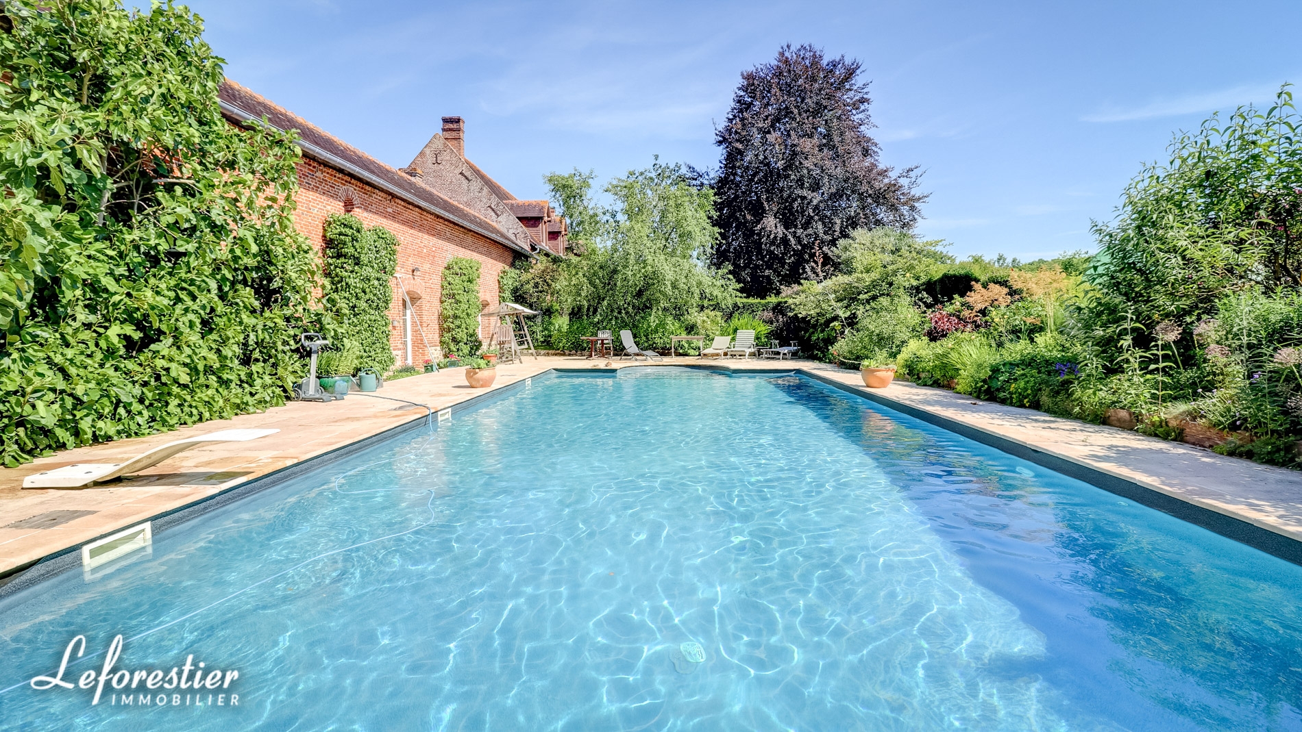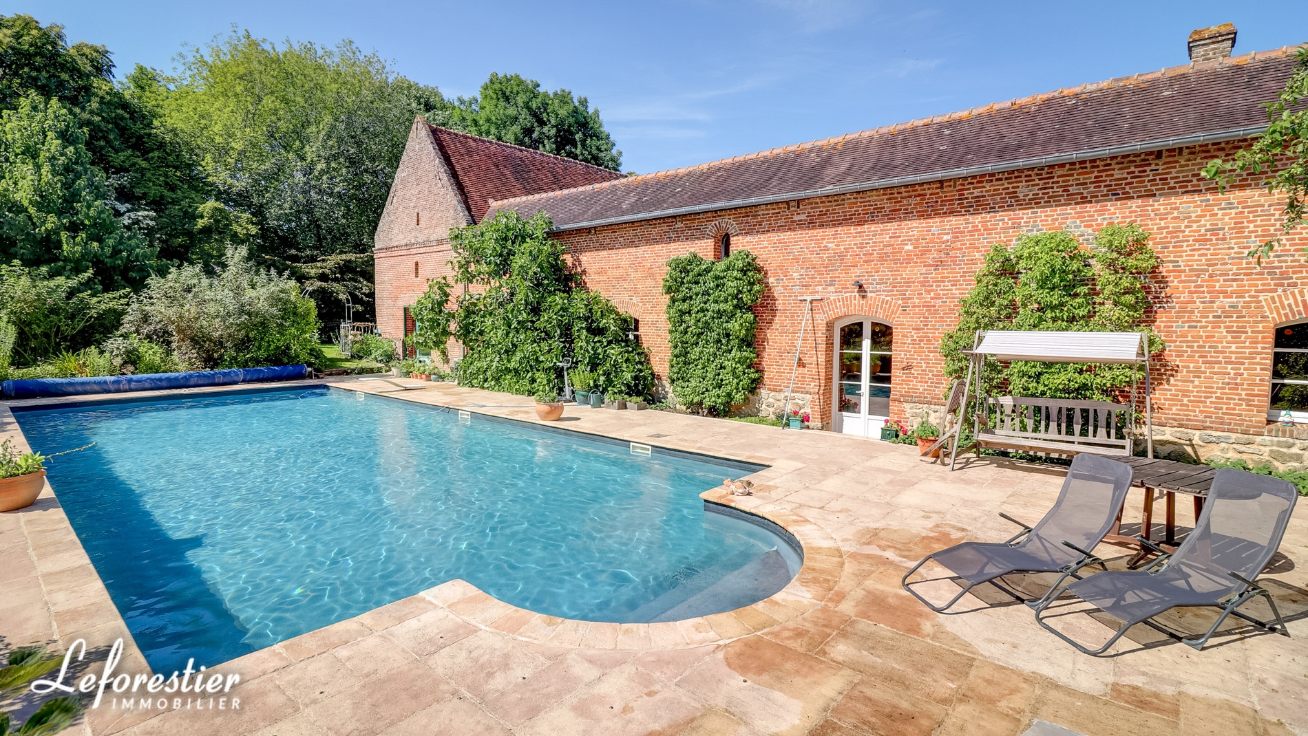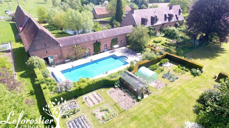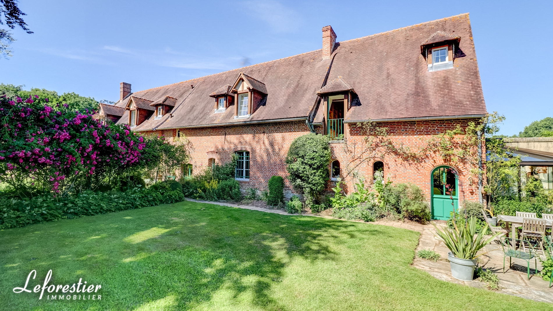 Au bout du chemin d’accès bordé d’herbages ou pâturent des vaches normandes, cette propriété s’ouvre sur une un ensemble de dépendances au centre desquelles une belle mare paysager recueille les eaux de pluie. La bâtisse principale domine cet espace et vous accueille par un hall doté d’un large escalier Louis 13 d’époque, décoré de tomettes de pays. A droite de ce hall, le vaste salon de 75 m2 avec la cheminée monumentale dans laquelle crépite un doux feu de bois est idéale pour organiser de belles réceptions. A l’opposé, une grande salle à manger elle aussi dotée de tomettes anciennes, d’une cheminée du Pays de Bray et d’une importante hauteur sous plafond confirme le standing et l’authenticité de cette demeure à vendre de Normandie. Le bureau joliment décoré de boiseries et bibliothèques s’ouvre sur la terrasse et la piscine abritée. Avec 6 chambres, de nombreuses salles de bains, une salle de jeux dans la cave voutée, voilà une maison pour y écrire une belle histoire de famille !