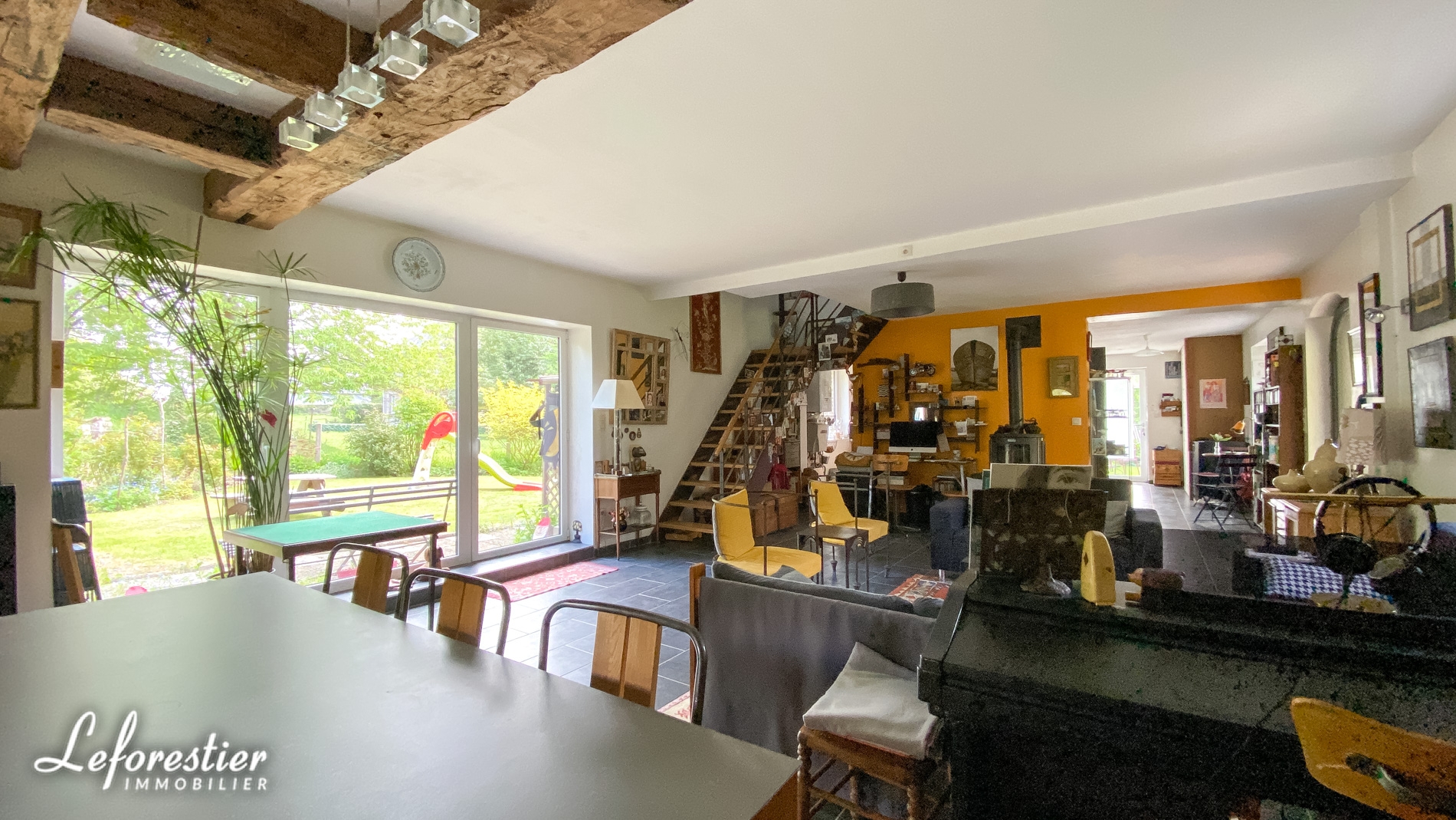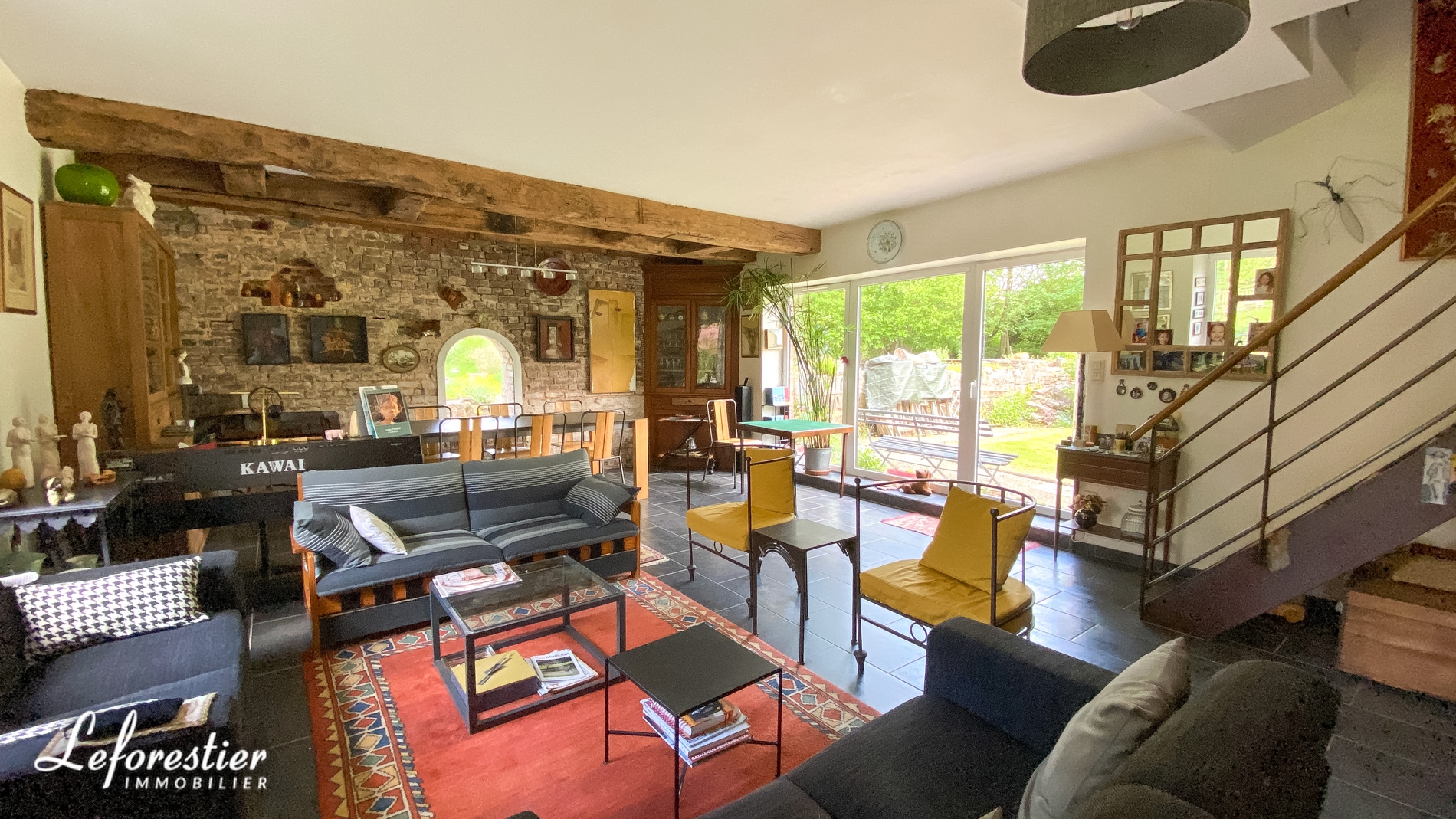 Devenue une maison de campagne très confortable sur les trois niveaux, les propriétaires actuels ont su parfaitement conserver le charme des lieux, en y ajoutant de nombreuses ouvertures laissant la lumière pénétrer abondamment. Les poutres intérieures ont simplement été nettoyées pour conserver leur couleur naturelle. Le rez-de-chaussée est entièrement consacré aux pièces de vie avec un grand salon-salle à manger pour recevoir, une cuisine ouverte sur un coin repas très conviviale pour les petits déjeuners familiaux. De plus, le cabinet de toilette est devenu salle de douche. Pratique après une baignade dans la rivière !