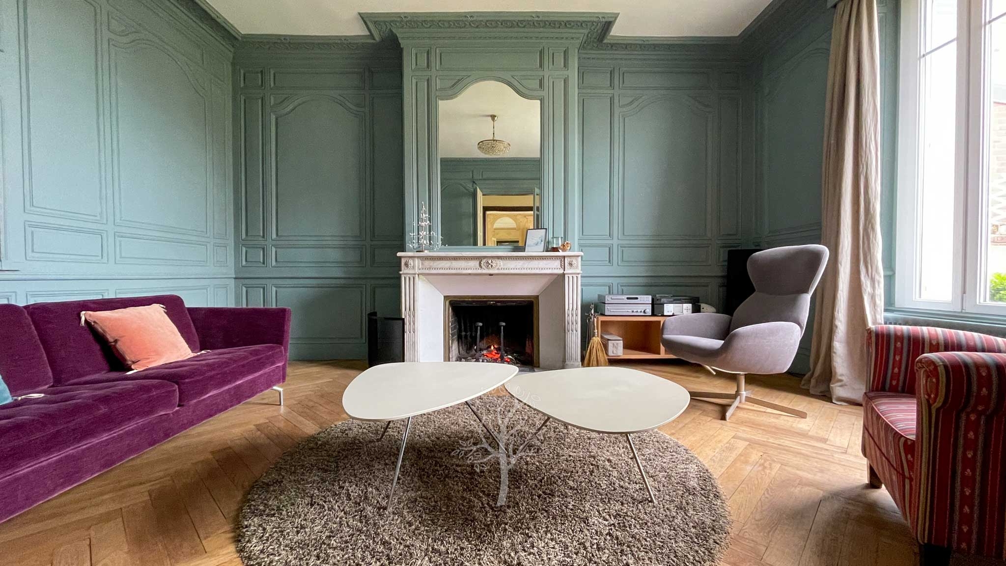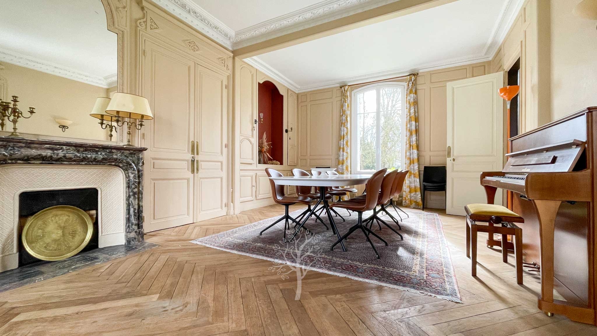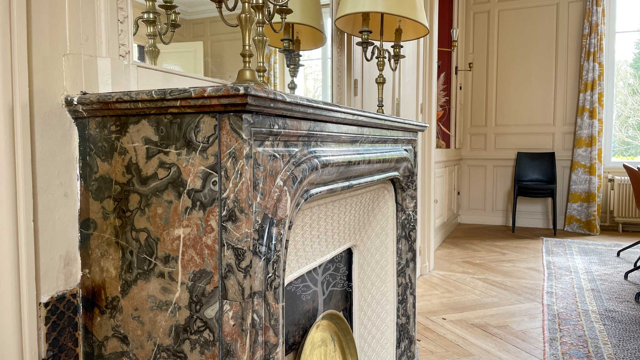 Les pièces du rez-de-chaussée, un salon intime et très cozy avec sa cheminée à l’âtre et une grande pièce de réception également avec une cheminée en marbre sont d’une élégante sobriété. Le parquet à bâton rompu sublime la lumière du soleil qui pénètre par les grandes ouvertures.
