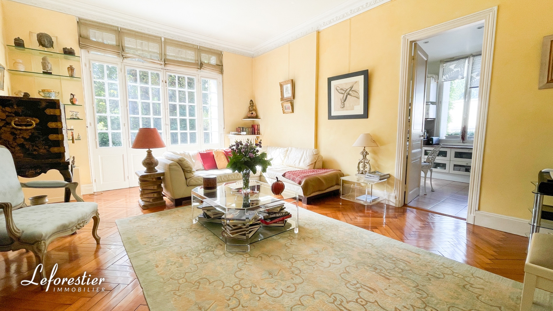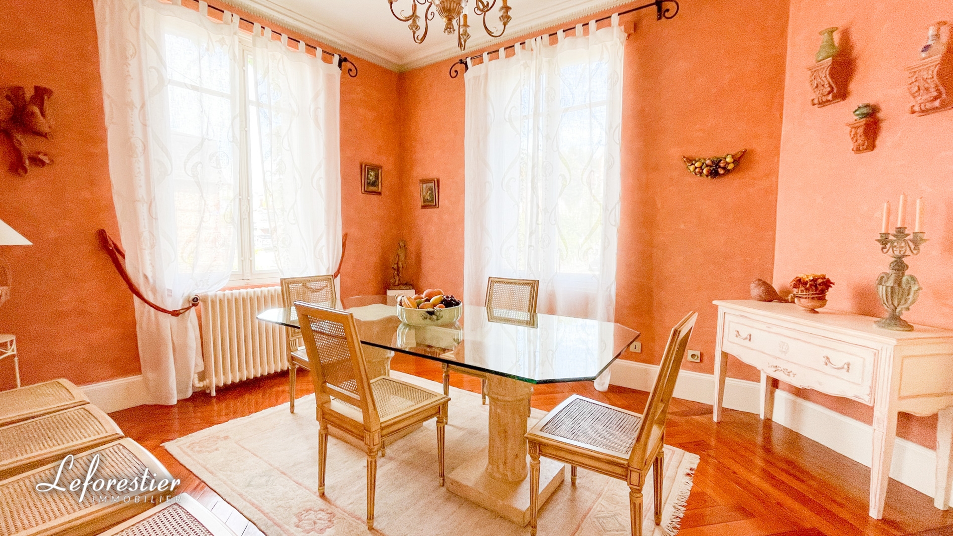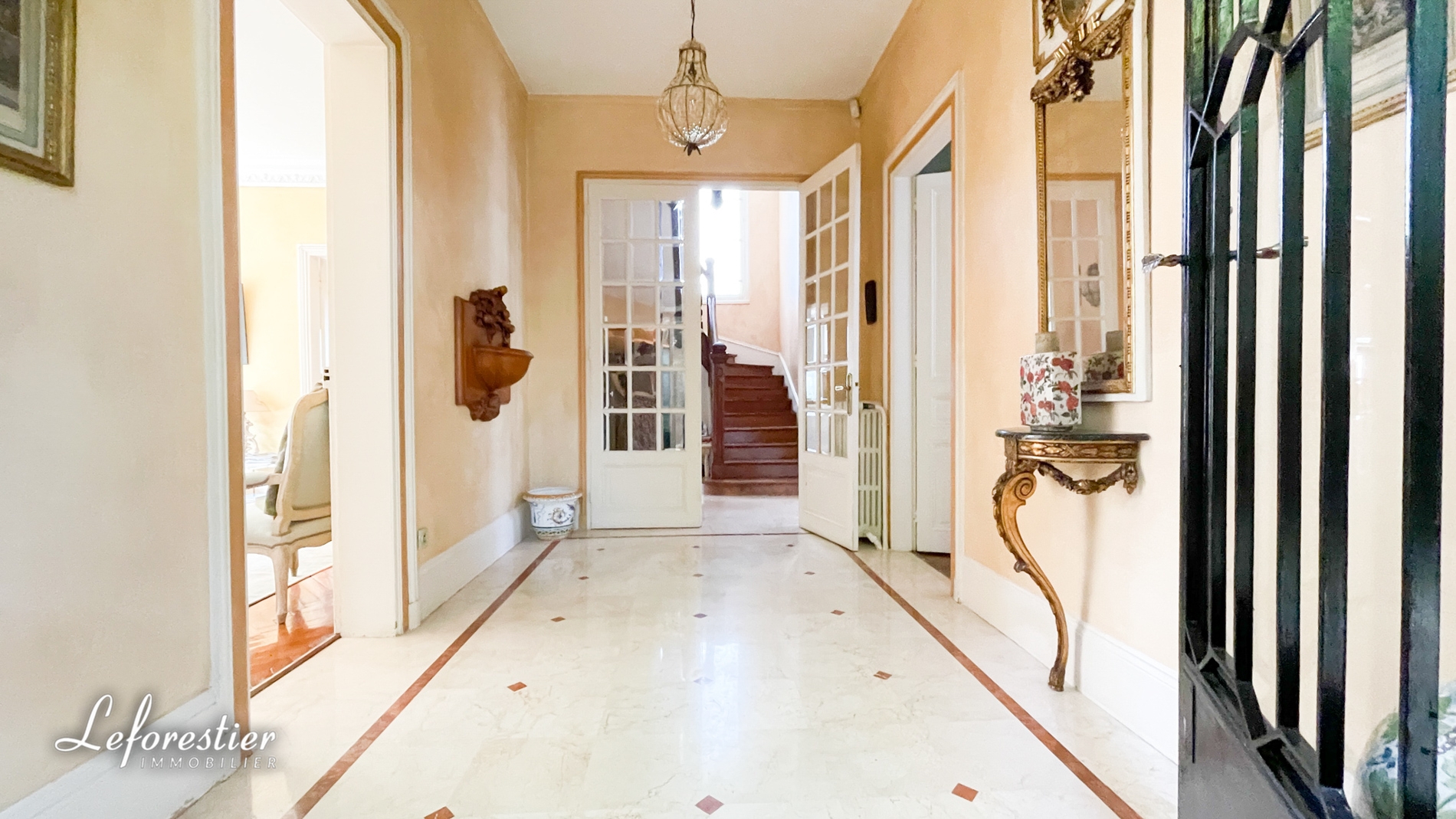 Après avoir gravi les quelques marches de l’entrée, on découvre un hall d’entrée avec un sol en marbre et un bel escalier. On y retrouve l’atmosphère des grandes maisons familiales et bourgeoises avec de grandes hauteurs sous plafond, moulures, portes vitrées et double porte à petit carreaux. La lumière est omniprésente dans toutes les pièces de vie : un bureau, les deux salons, la salle à manger avec de belles cheminées qui complète l’élégance des lieux.