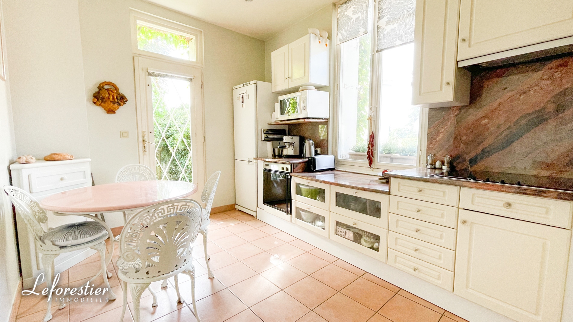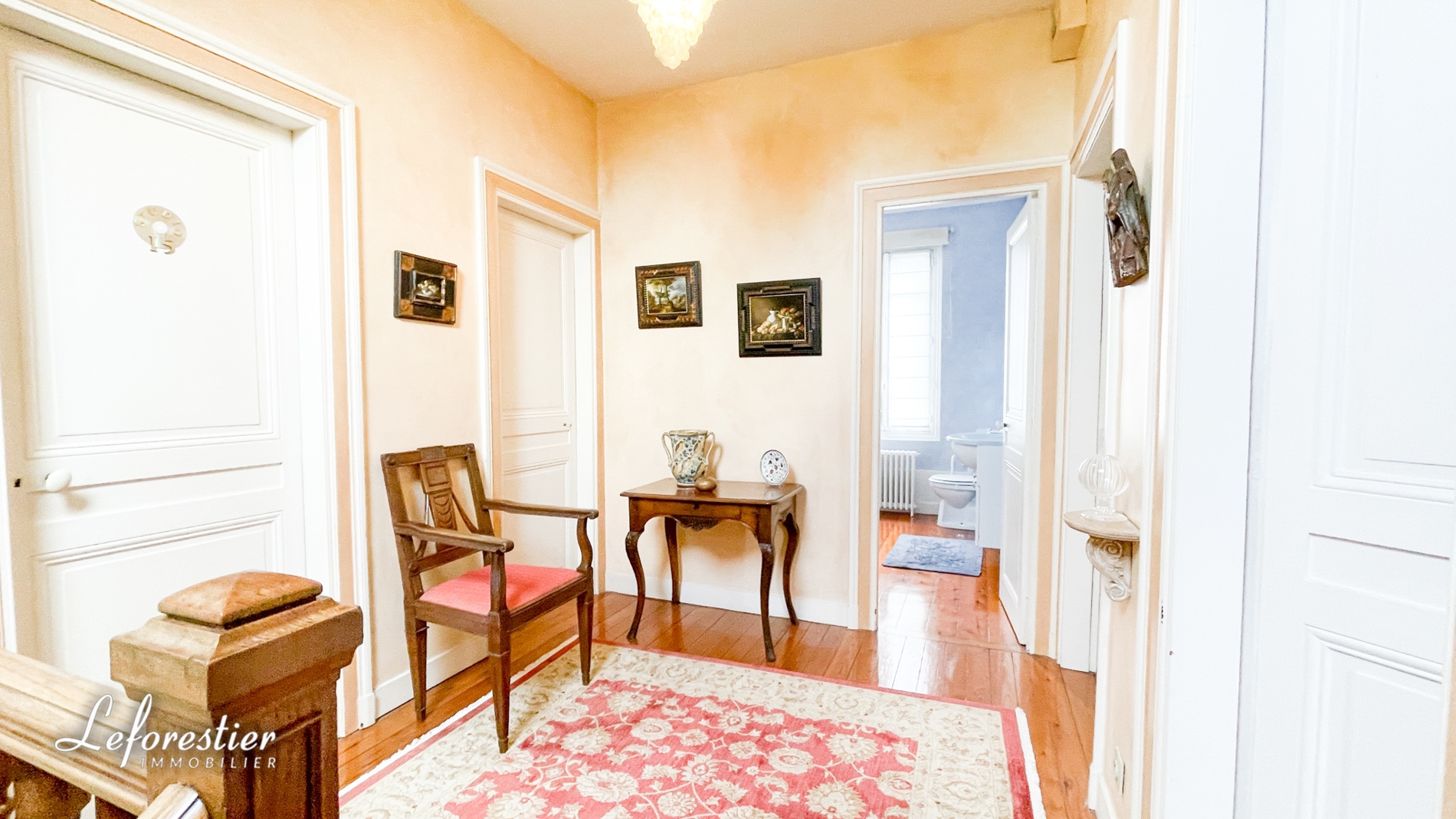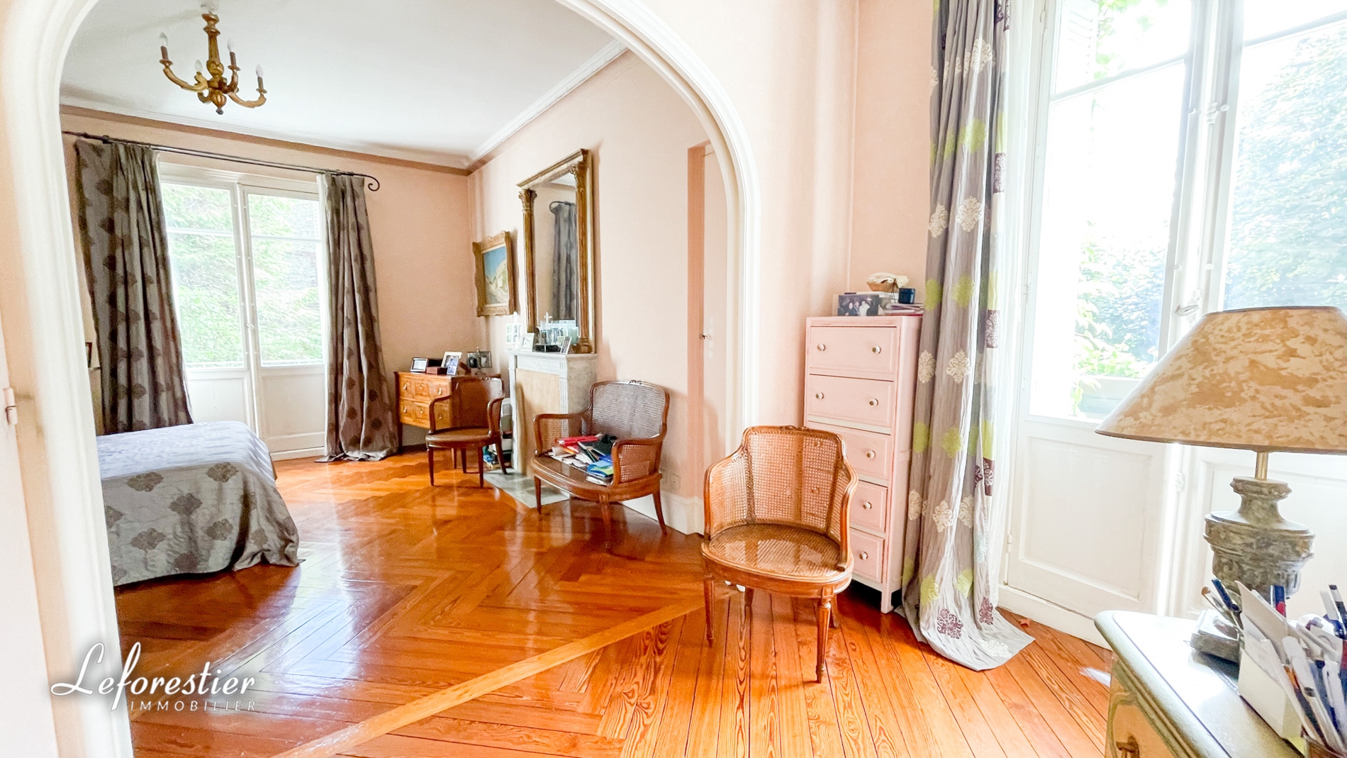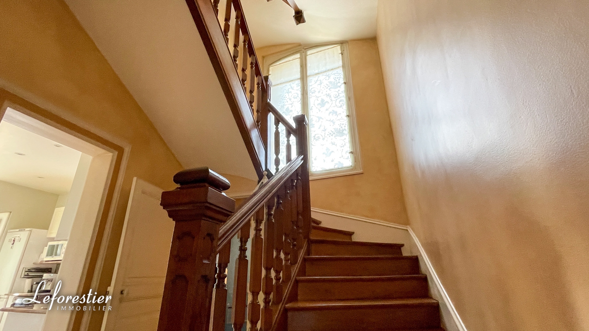 Après avoir gravi les quelques marches de l’entrée, on découvre un hall d’entrée avec un sol en marbre et un bel escalier. On y retrouve l’atmosphère des grandes maisons familiales et bourgeoises avec de grandes hauteurs sous plafond, moulures, portes vitrées et double porte à petit carreaux. La lumière est omniprésente dans toutes les pièces de vie : un bureau, les deux salons, la salle à manger avec de belles cheminées qui complète l’élégance des lieux.