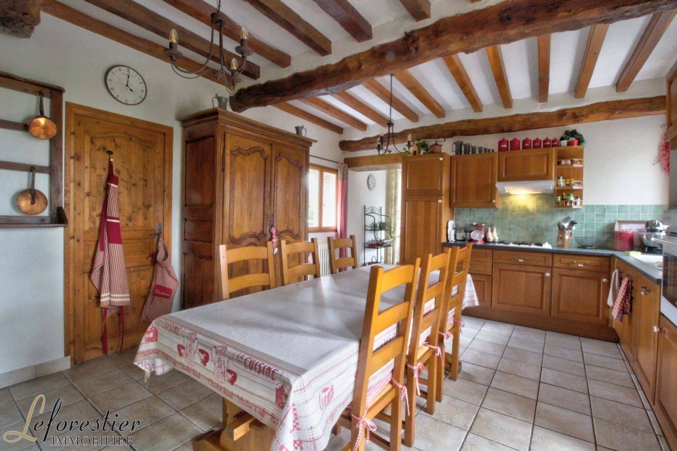 La porte centrale s’ouvre vers un hall dont l’escalier a conservé ses anciennes tomettes. A droite, le salon avec parquet, boiseries et cheminée d’époque est douillé et lumineux. A gauche, la salle à manger dispose également d’une cheminée avec un insert. L’immense cuisine à l’ambiance familiale résonne encore des repas pris par les moissonneurs devant la grande cheminée, en particulier le jour de la Parcé, fête traditionnelle marquant la fin de la moisson.