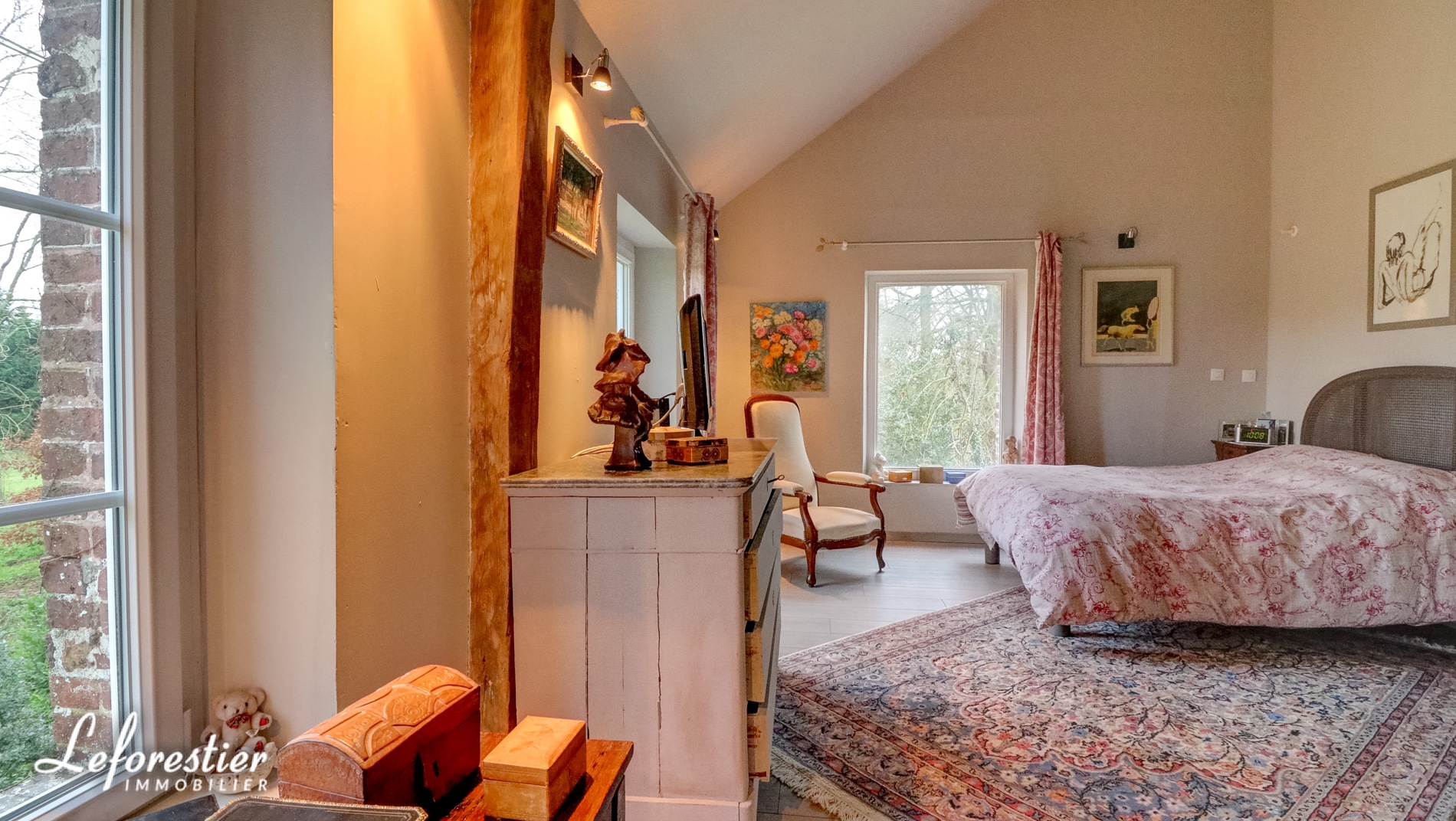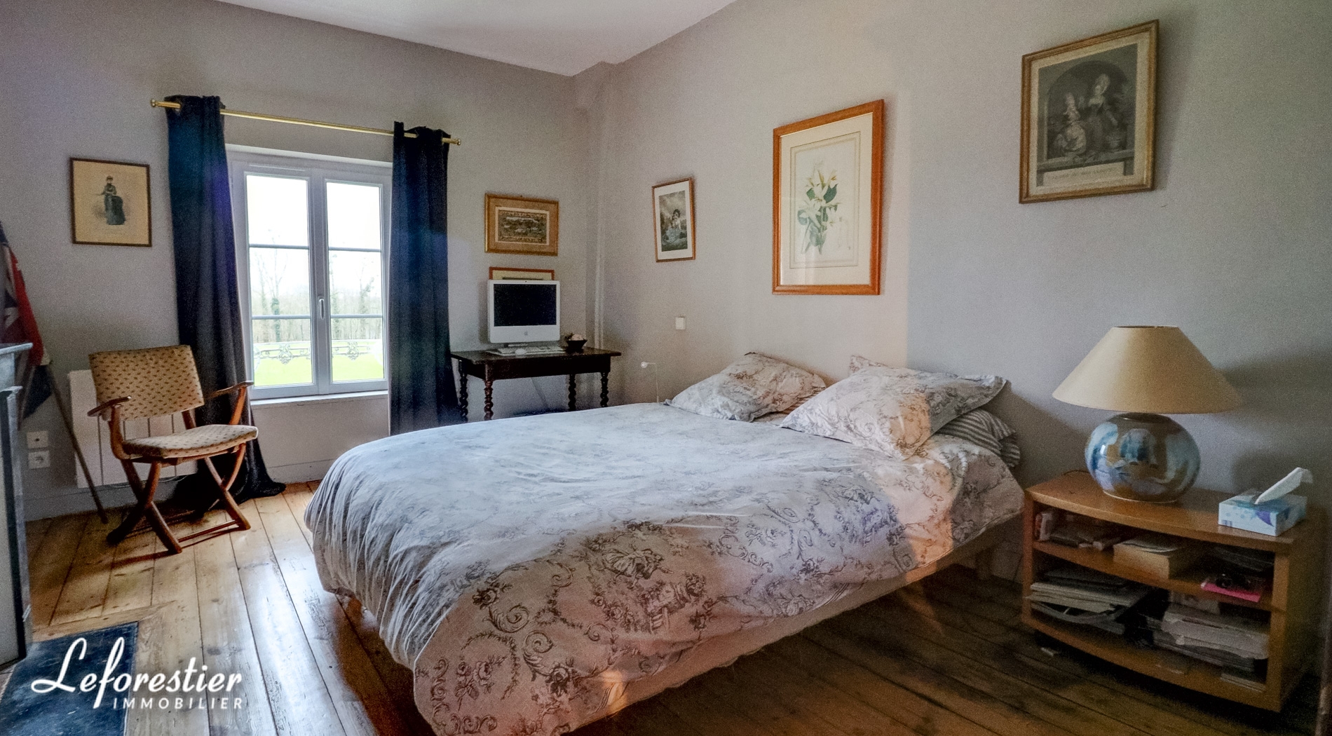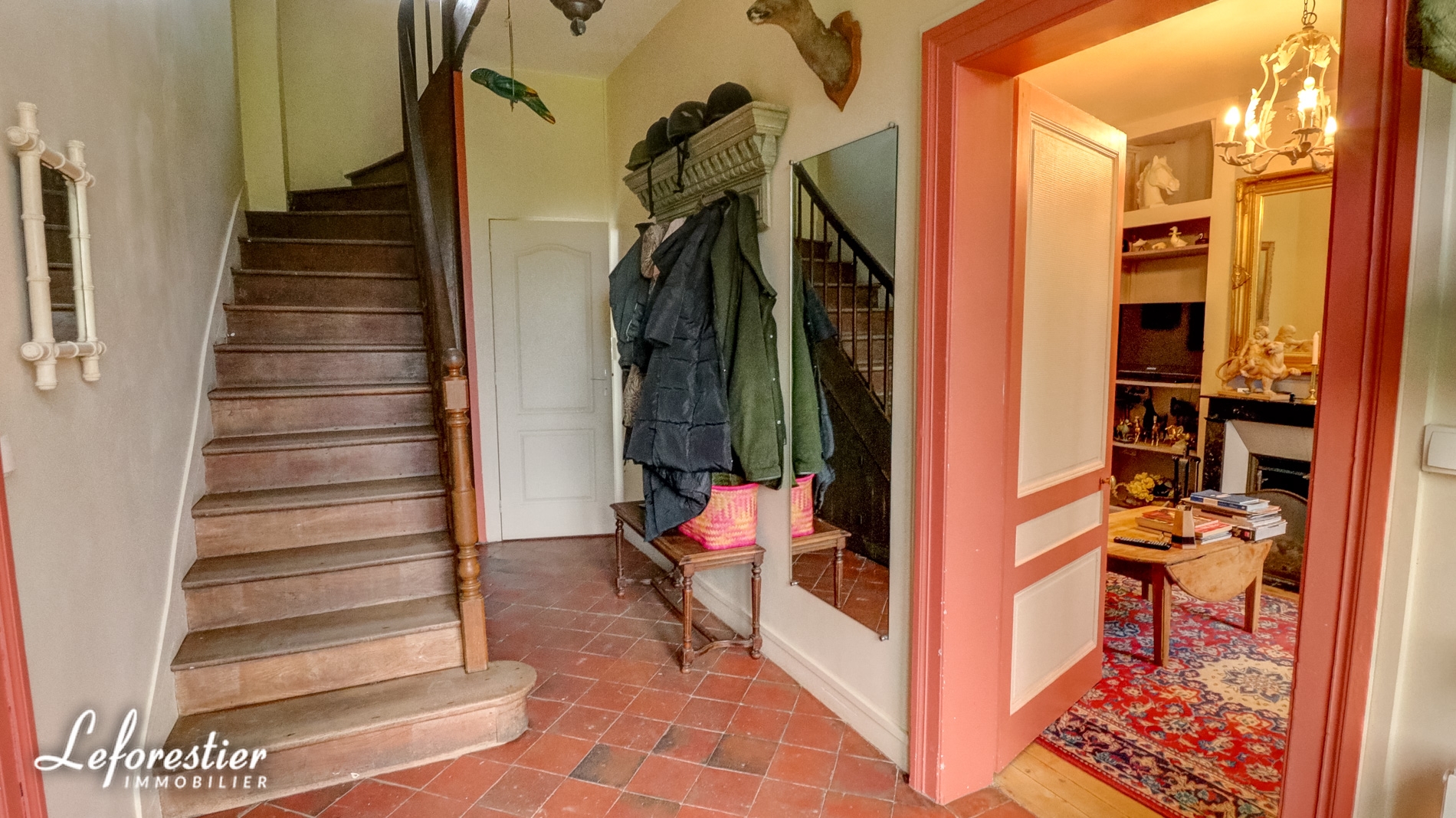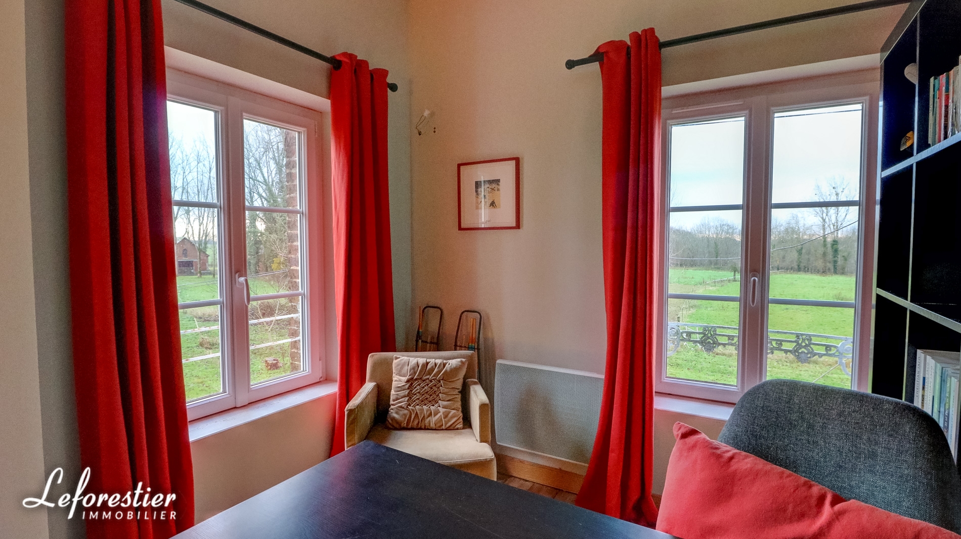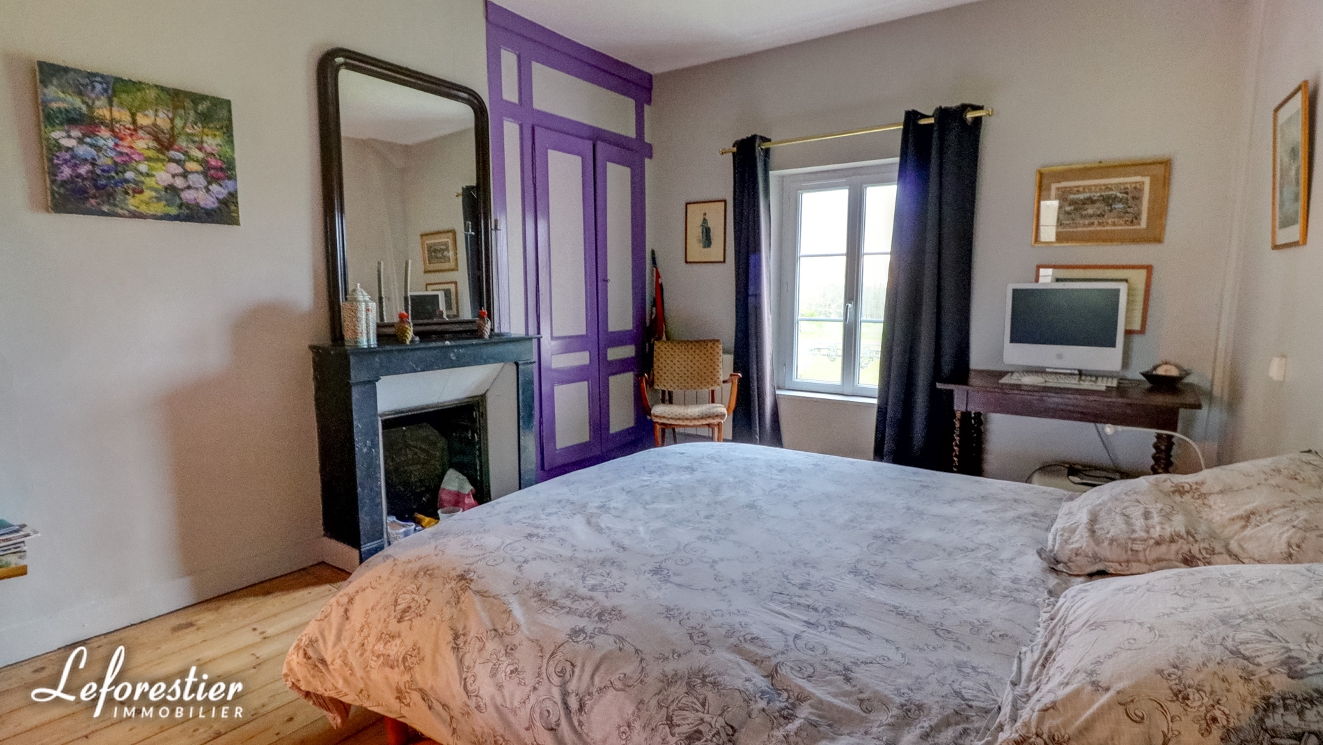 Après avoir parcouru une petite allée, nous voici devant cette belle bâtisse datant de la fin du XIXème siècle. Son environnement calme et préservé saura charmer les amoureux de la nature. Construite en brique, les matériaux sont restés authentiques tout comme les cheminées et le parquet du rez-de-chaussée. A l’étage, les cinq chambres sont confortables et lumineuses et disposent de deux pièces d’eau. La vue de l’étage vers la campagne environnante invite à l’apaisement et à la rêverie. La couverture récente en ardoise naturelle respecte l’authenticité de cette belle propriété de caractère.