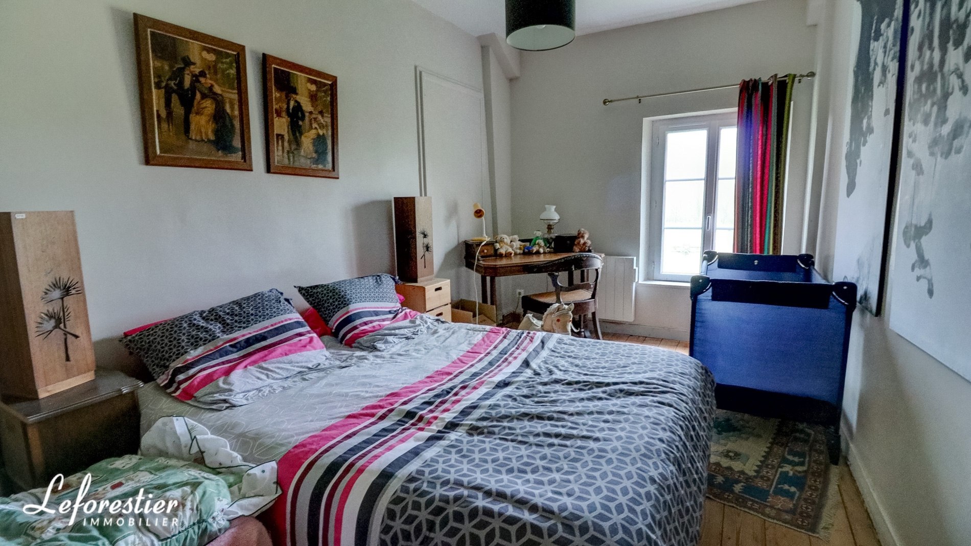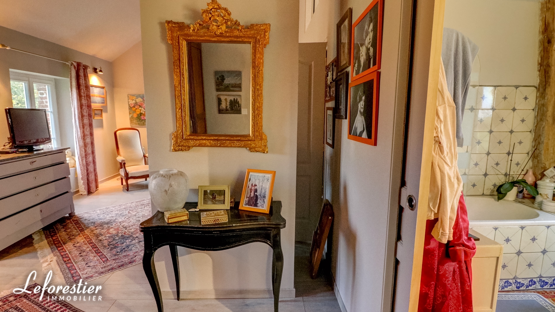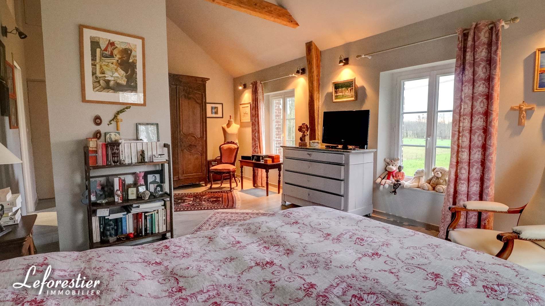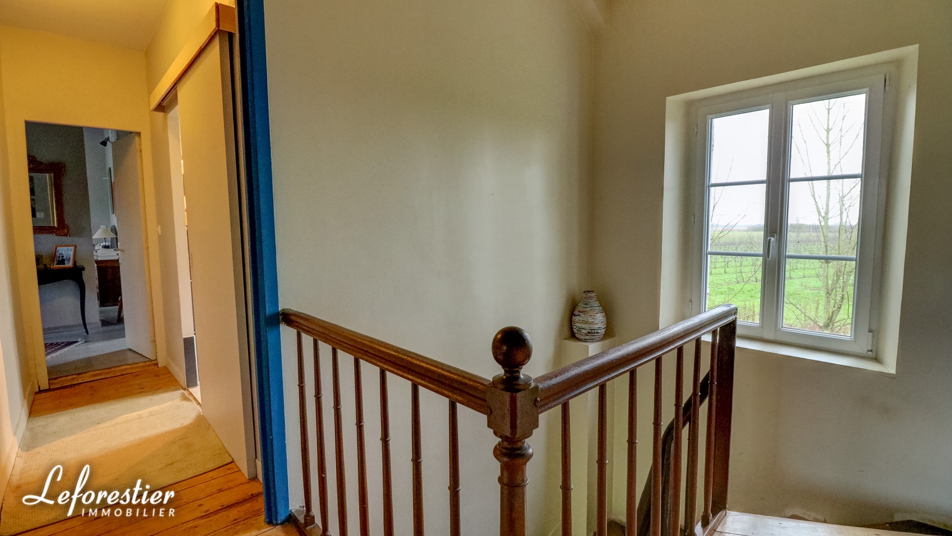 Après avoir parcouru une petite allée, nous voici devant cette belle bâtisse datant de la fin du XIXème siècle. Son environnement calme et préservé saura charmer les amoureux de la nature. Construite en brique, les matériaux sont restés authentiques tout comme les cheminées et le parquet du rez-de-chaussée. A l’étage, les cinq chambres sont confortables et lumineuses et disposent de deux pièces d’eau. La vue de l’étage vers la campagne environnante invite à l’apaisement et à la rêverie. La couverture récente en ardoise naturelle respecte l’authenticité de cette belle propriété de caractère.