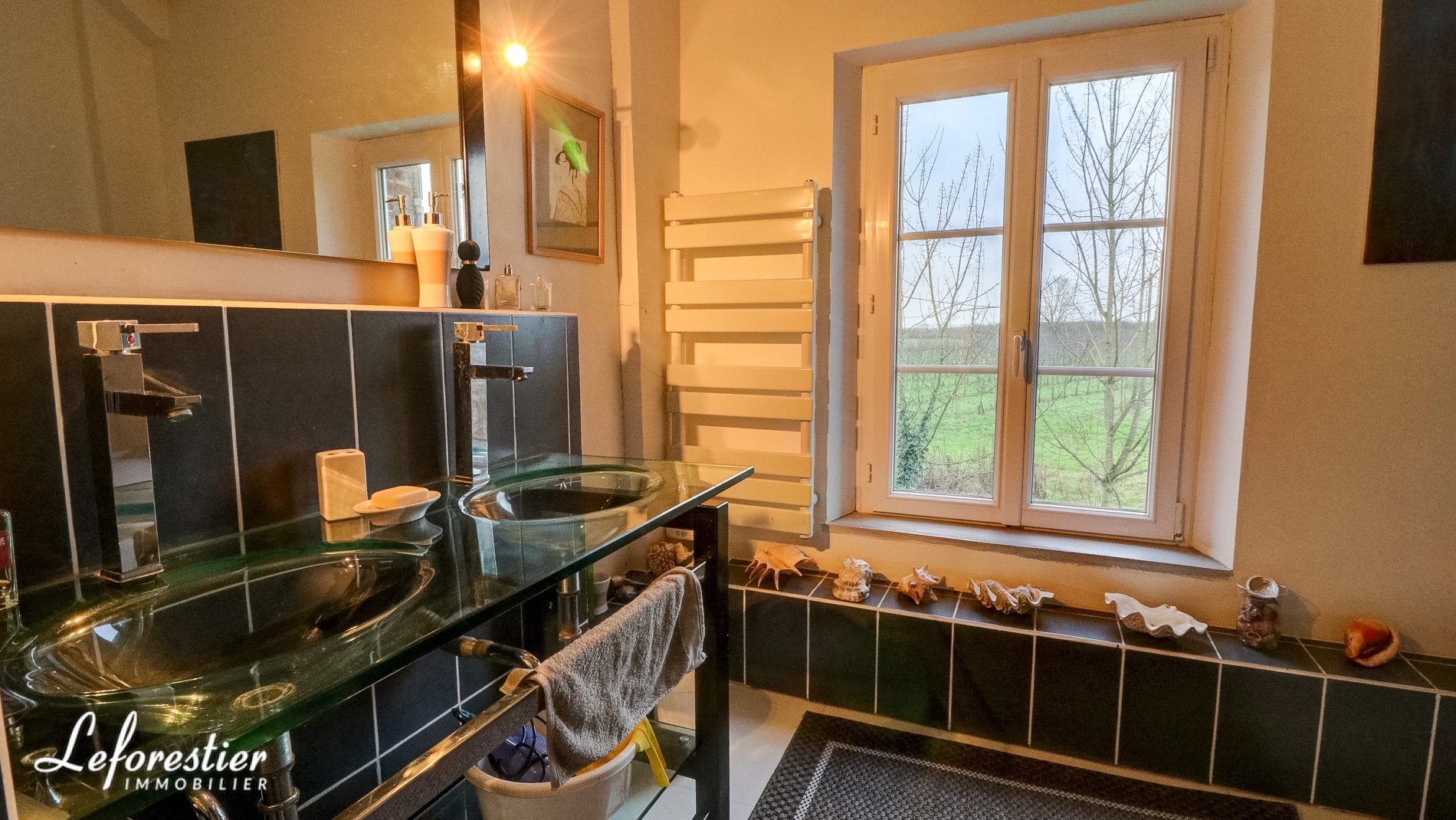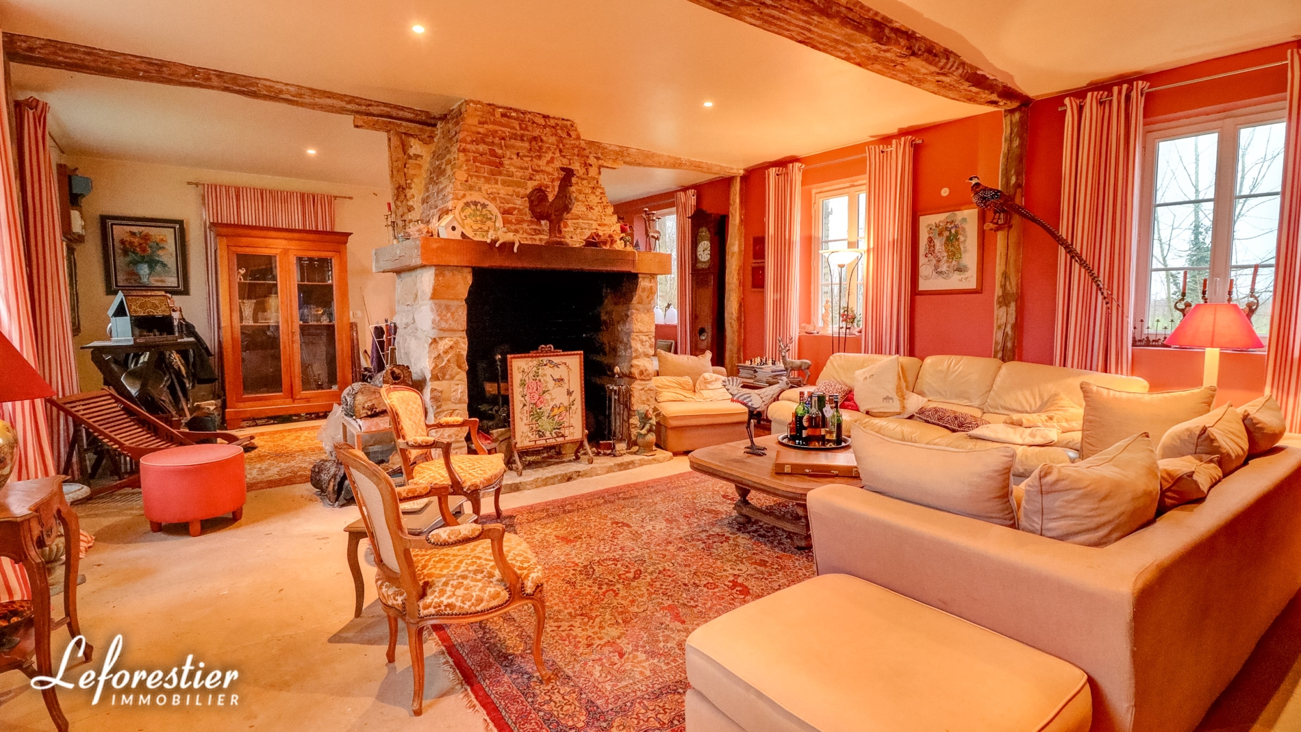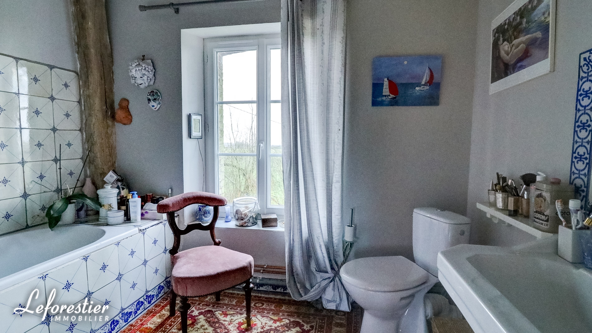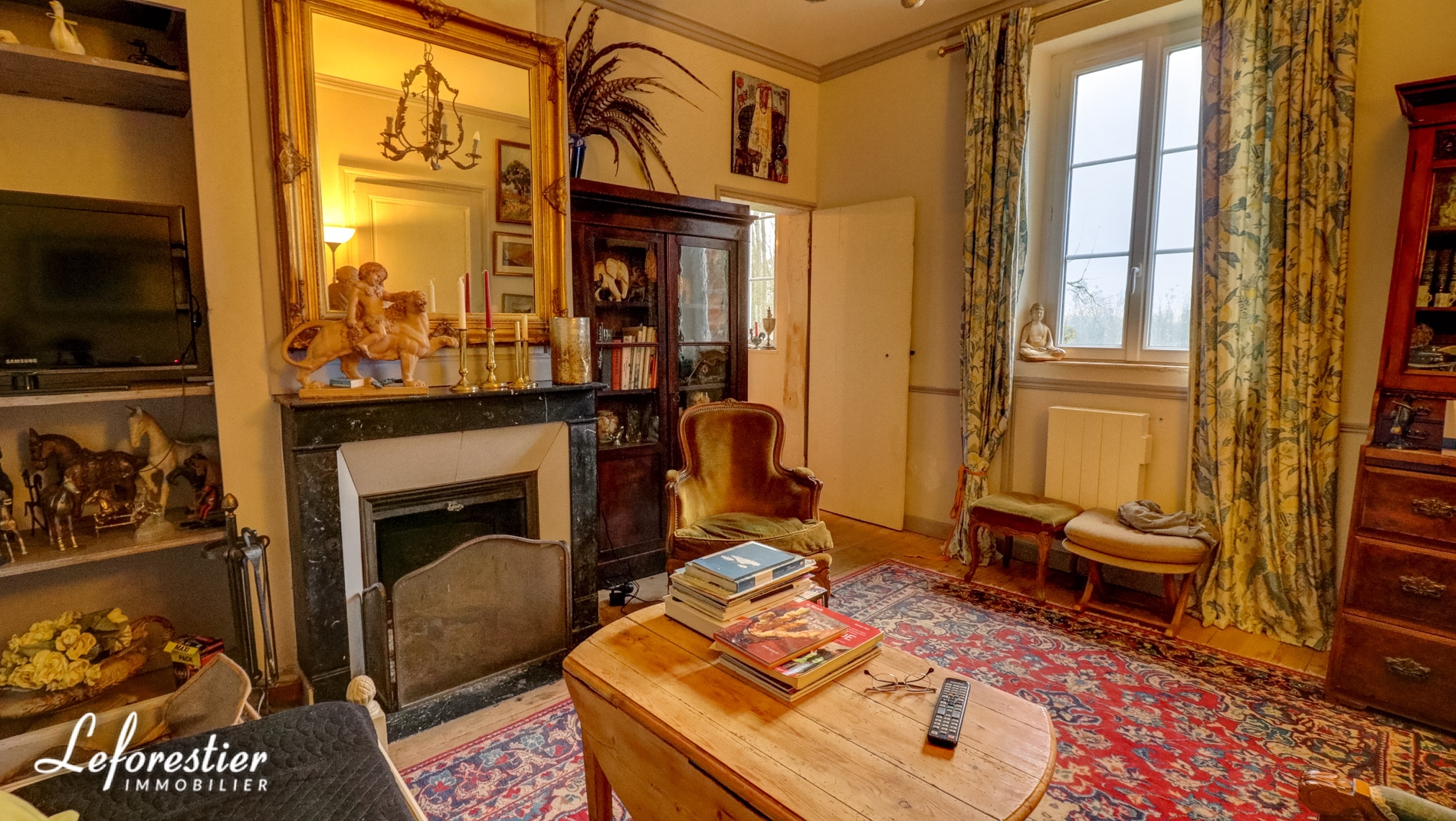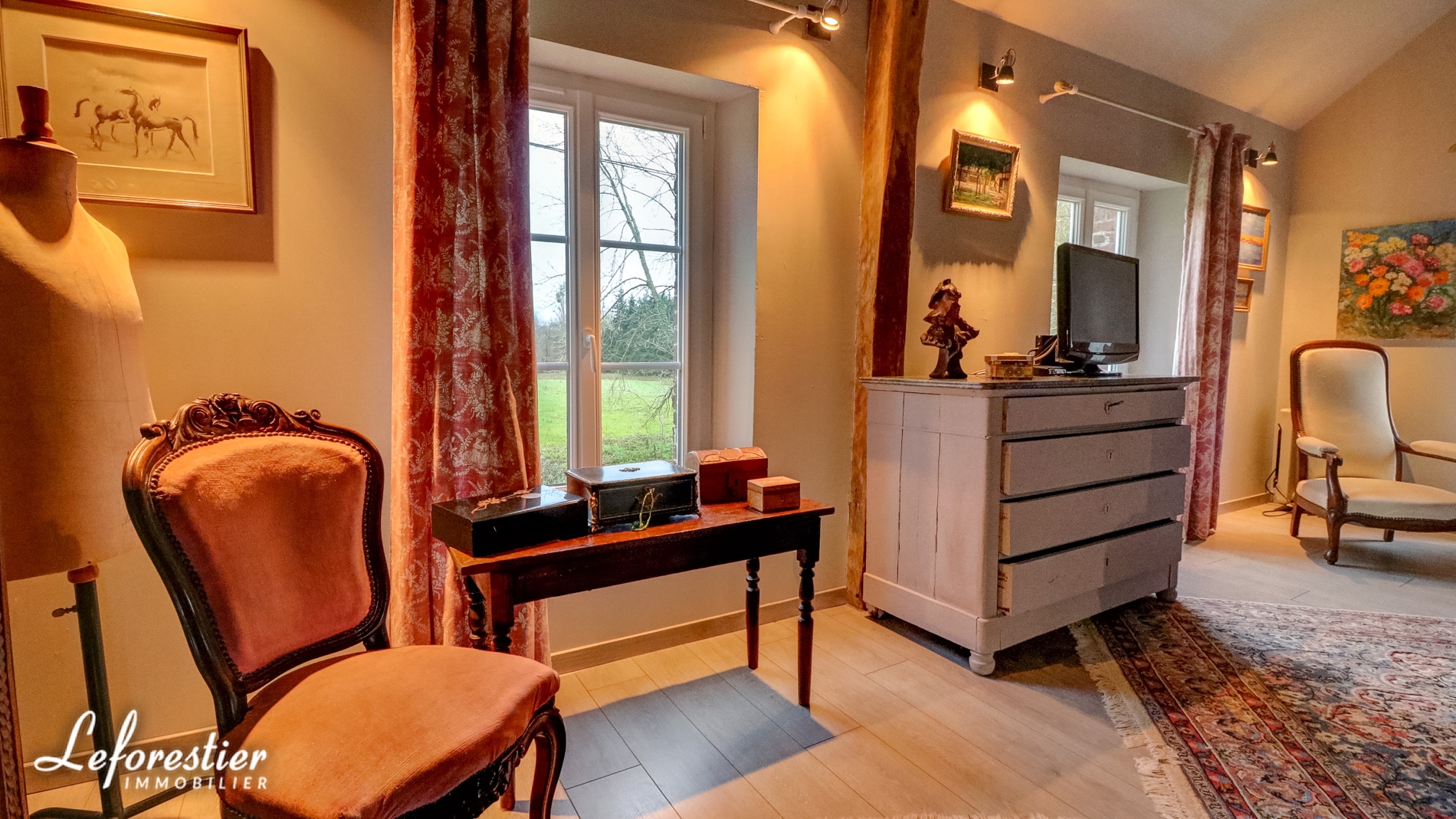 Après avoir parcouru une petite allée, nous voici devant cette belle bâtisse datant de la fin du XIXème siècle. Son environnement calme et préservé saura charmer les amoureux de la nature. Construite en brique, les matériaux sont restés authentiques tout comme les cheminées et le parquet du rez-de-chaussée. A l’étage, les cinq chambres sont confortables et lumineuses et disposent de deux pièces d’eau. La vue de l’étage vers la campagne environnante invite à l’apaisement et à la rêverie. La couverture récente en ardoise naturelle respecte l’authenticité de cette belle propriété de caractère.