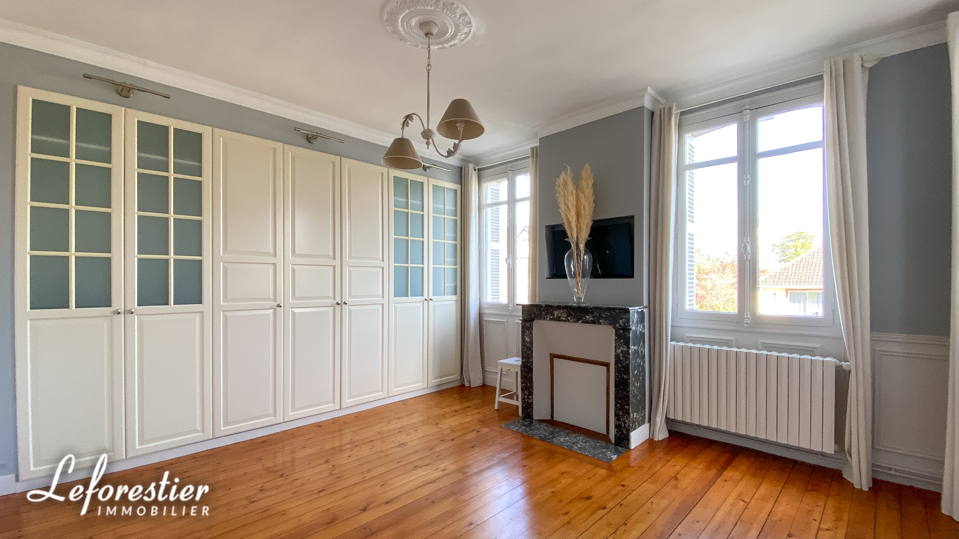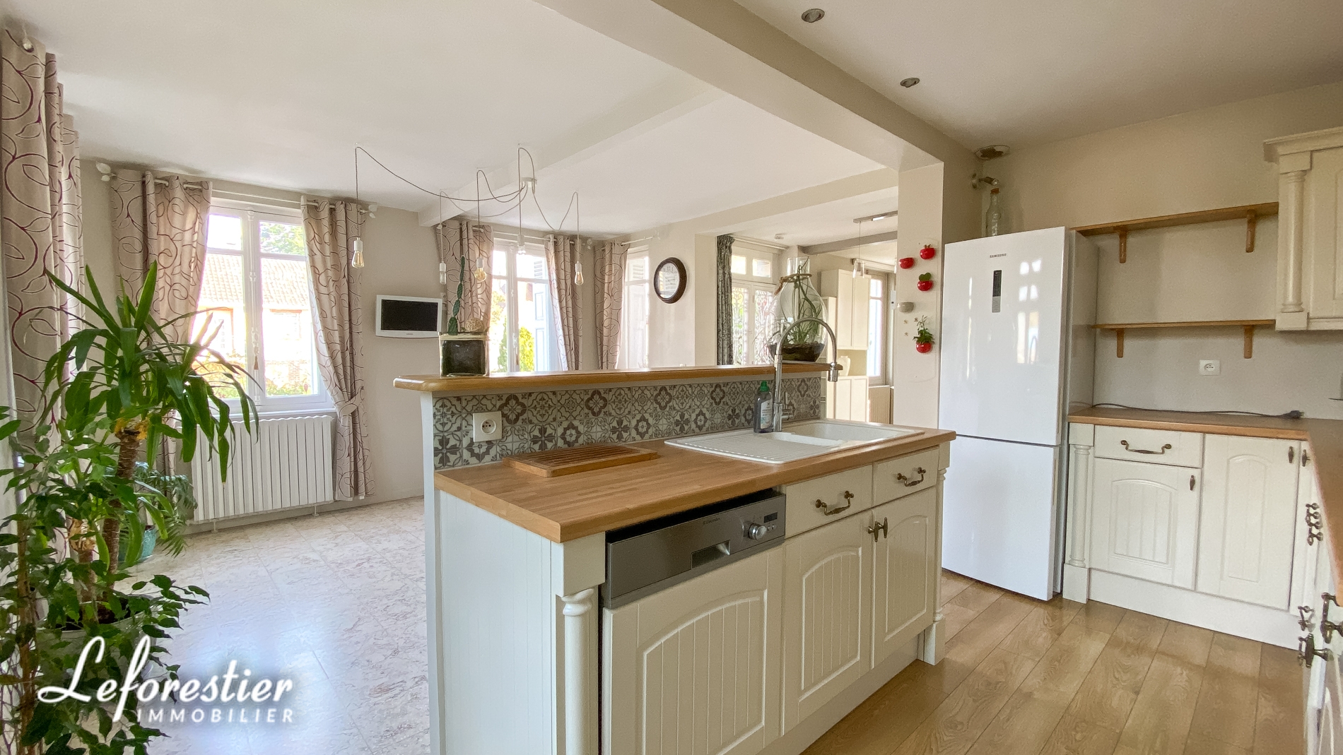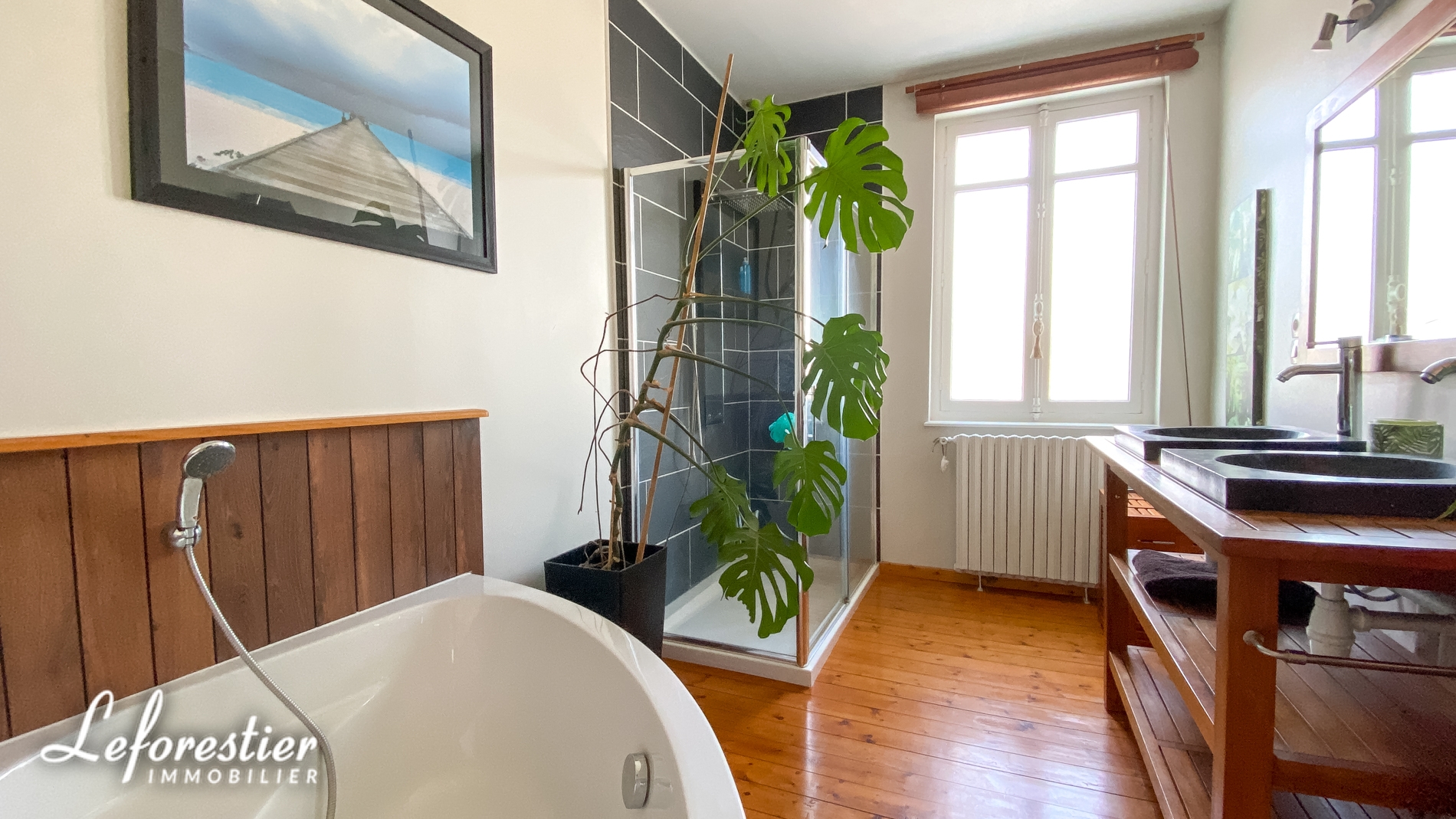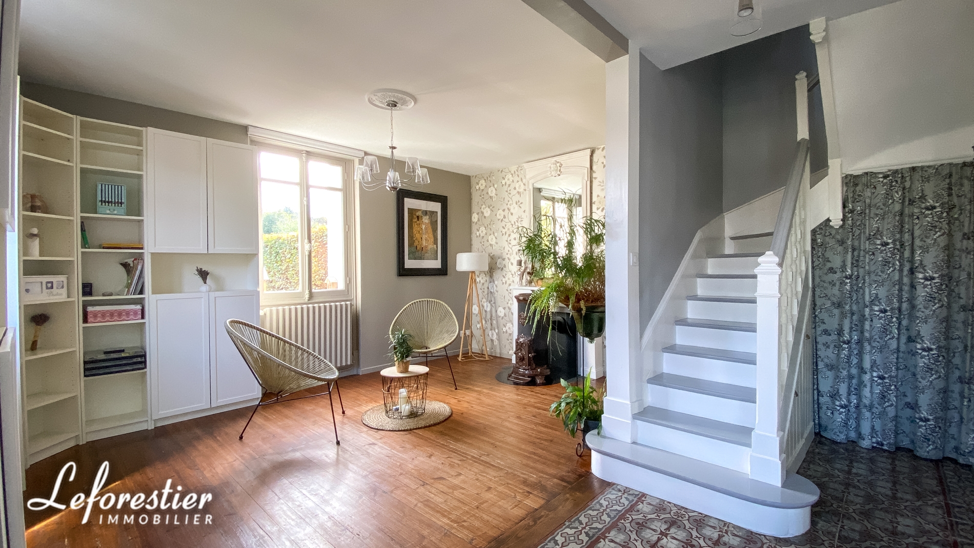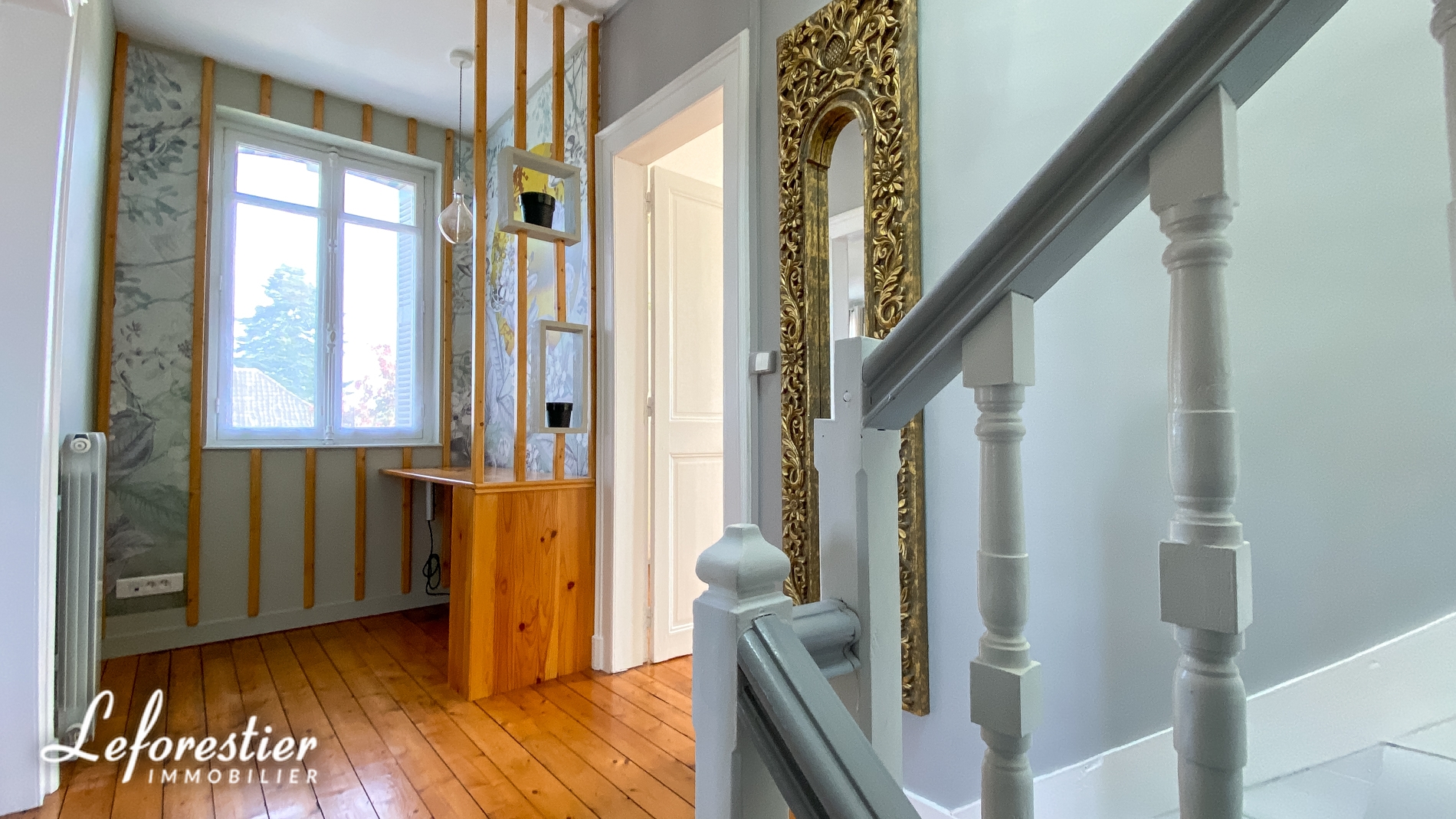 La propriété est entièrement transformée au goût de jour en respectant l’architecture de l’époque, avec le charme incontestable de ces maisons de notables de la fin du XIX e siècle. Vous êtes accueillis par un sol en carreaux de ciment d’origine. Les cloisons ont été abattues pour agrandir l’espace . Ainsi vous bénéficiez d’une très agréable pièce de vie avec son poêle Godin. Une cuisine aménagée, une jolie véranda et une pièce d’eau très lumineuse complètent le rez-de-chaussée.