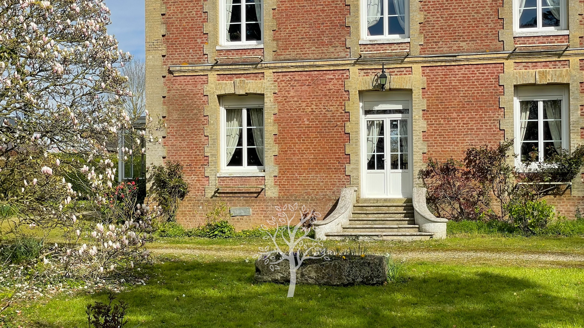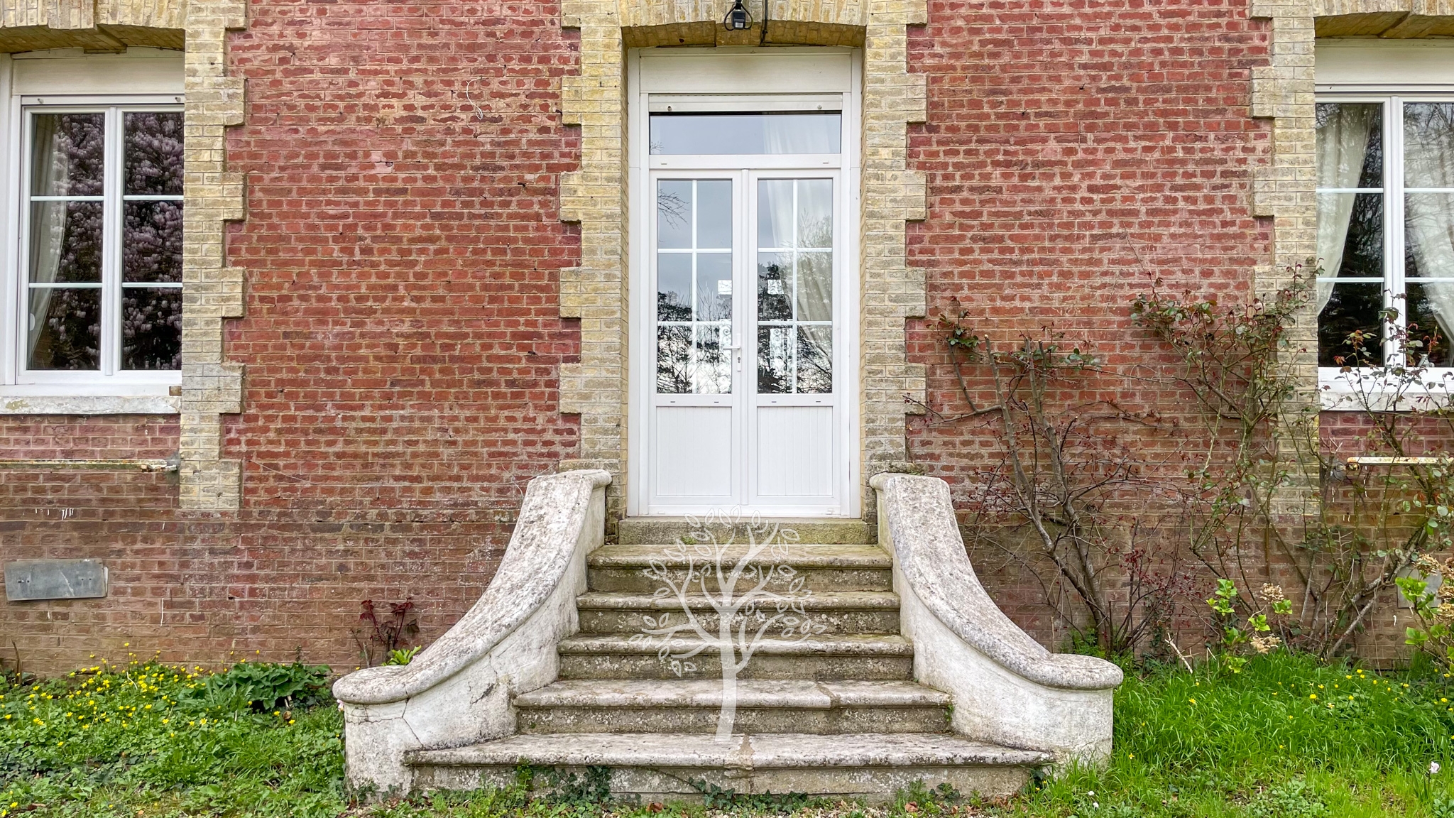 On franchit le portail de la propriété et cette magnifique demeure impose tout de suite aux visiteurs. On retrouve les codes de la maison bourgeoise avec une solide construction brique, de nombreuses ouvertures et une vue dégagée sur le parc.