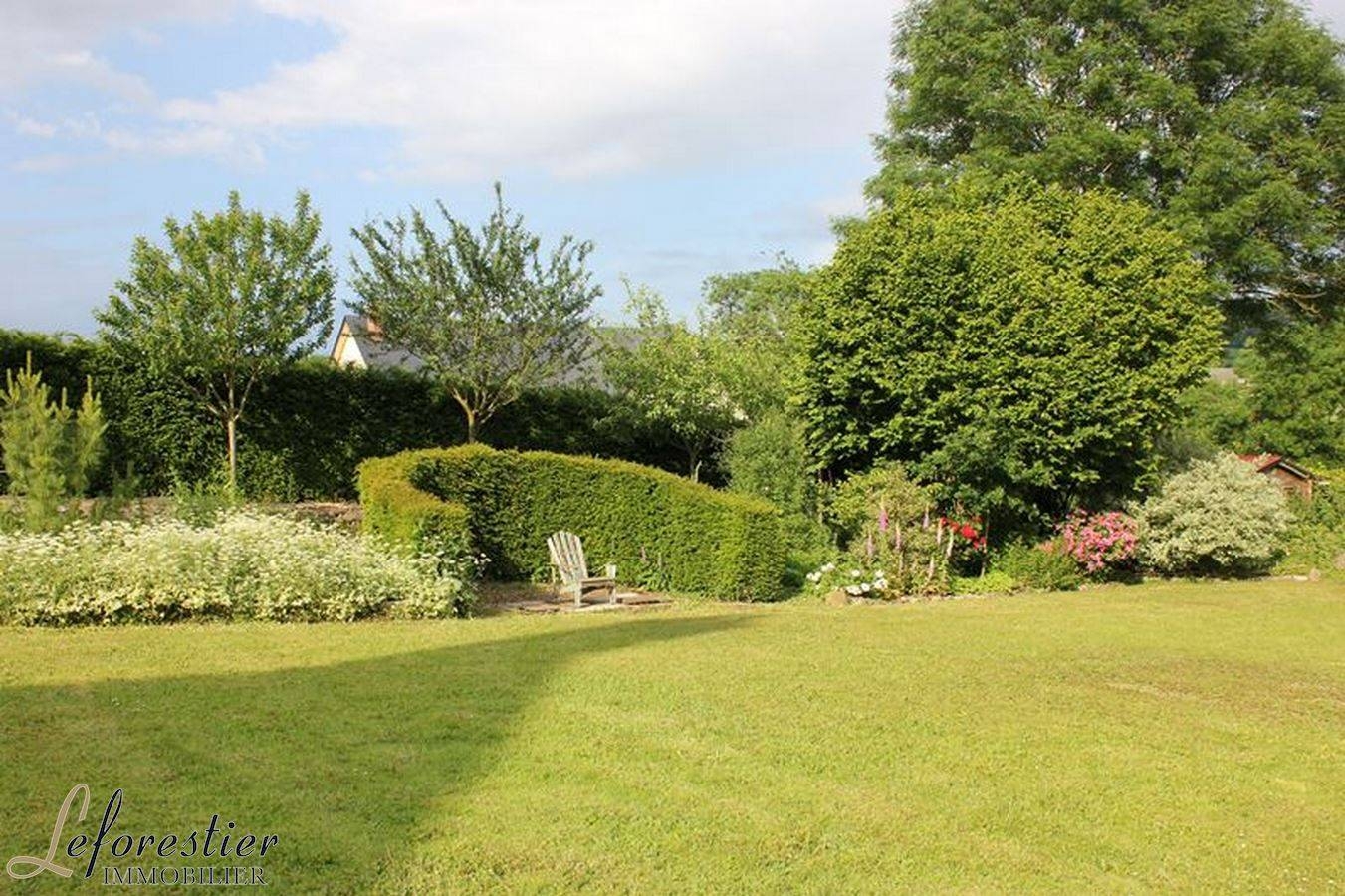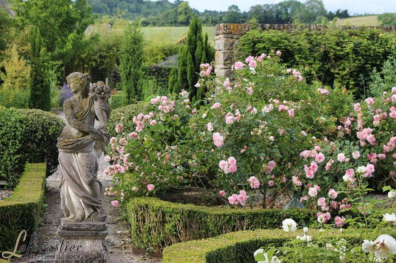 Le jardin se divise en trois parties : un jardin à la française avec un bassin et composé de massifs mélangeant rosiers anciens et odorants avec de nombreuses variétés de plantes choisies avec subtilité, confirmant le charme de la propriété ; une pelouse pour les jeux des petits enfants, et un potager avec une serre pour profiter des légumes et des fruits comme les framboises et fraises qui poussent en abondance.