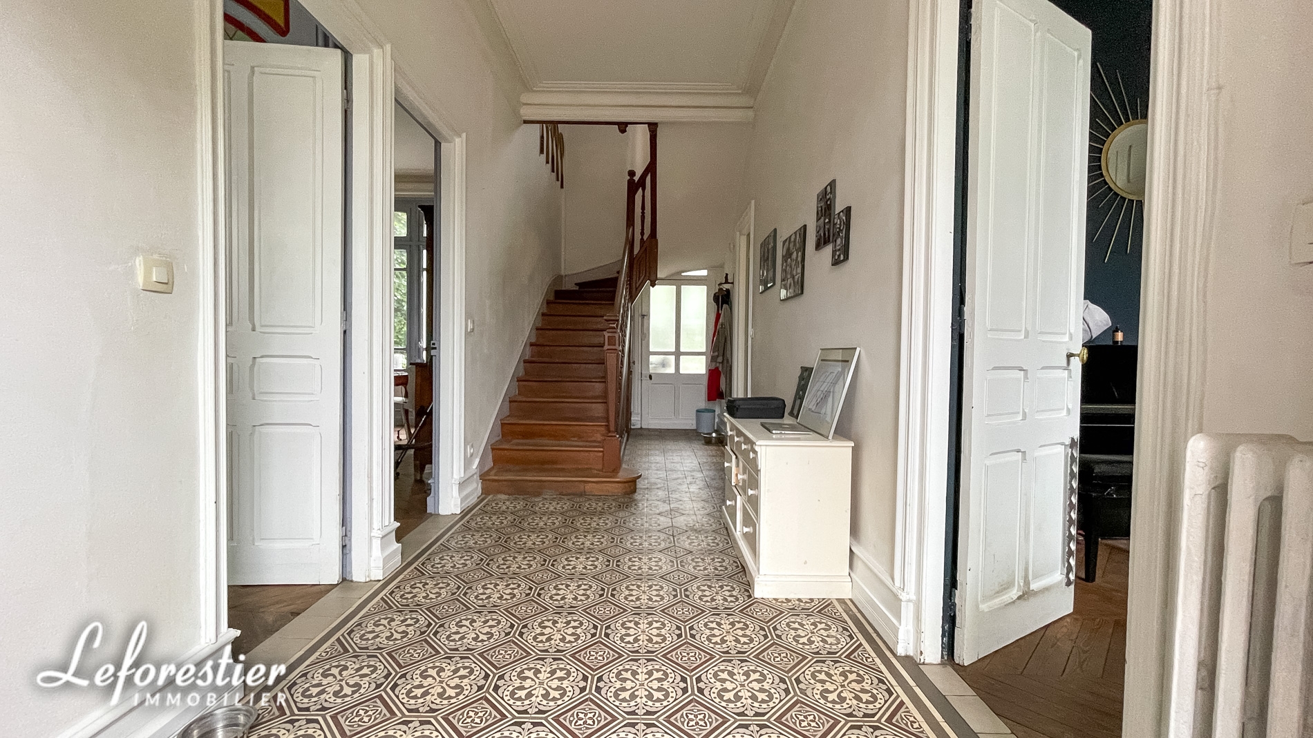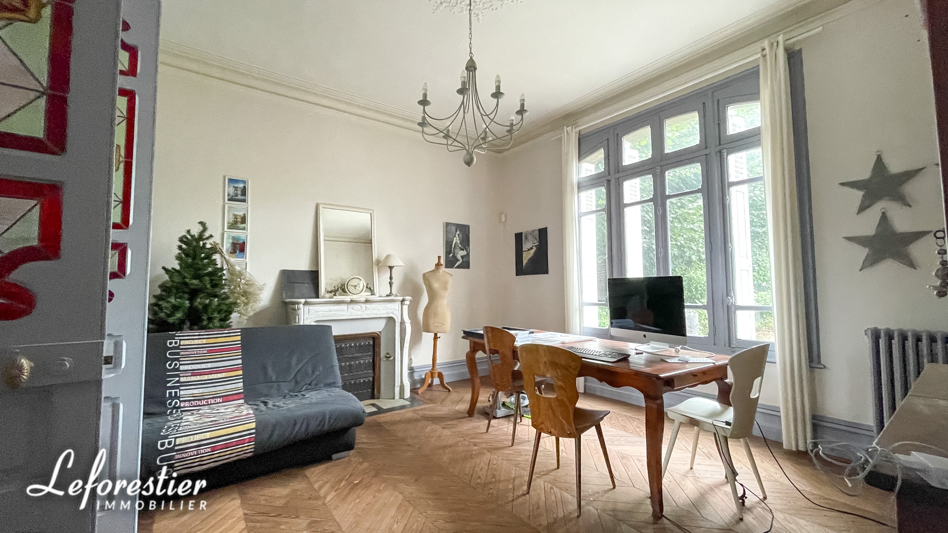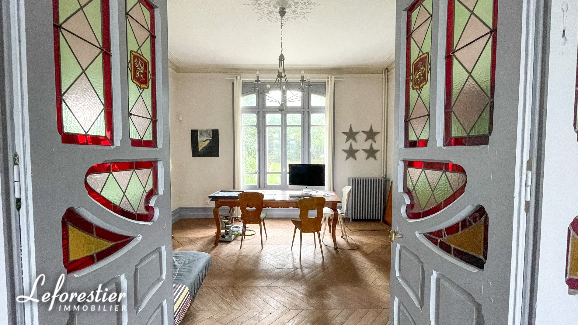 Les espaces de vie sont spacieux et très lumineux avec de splendides éléments très reconnaissables de ces maisons de maître du début du siècle : Les moulures aux plafonds, les très beaux parquets en chêne, les cheminées en marbre et les portes qui ouvrent sur le séjour richement décoré de vitraux d’époque.