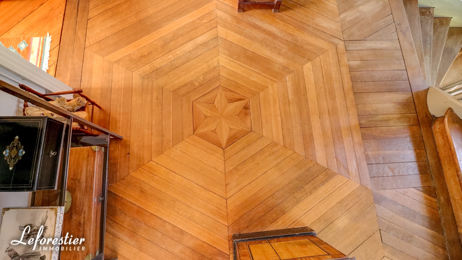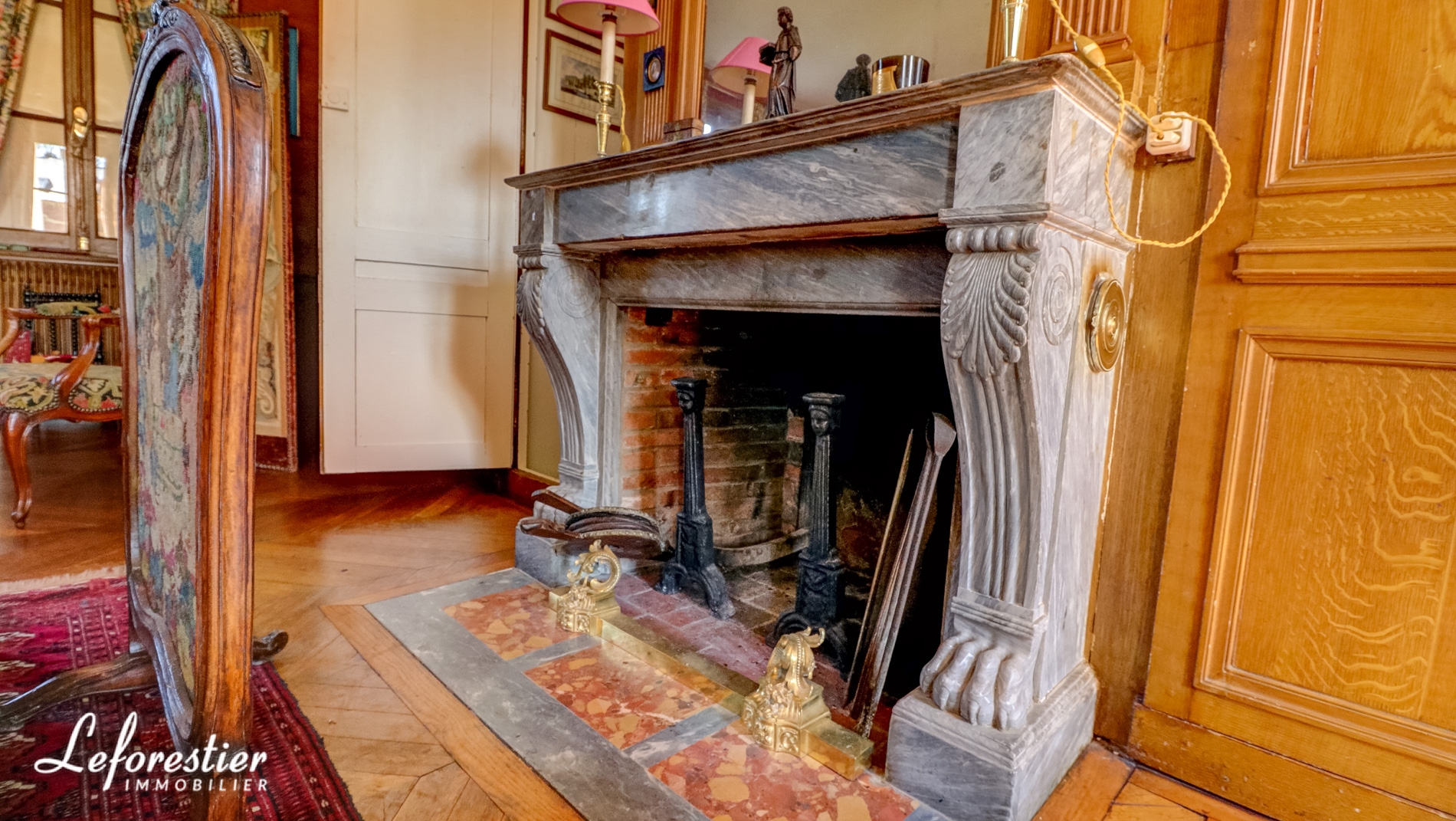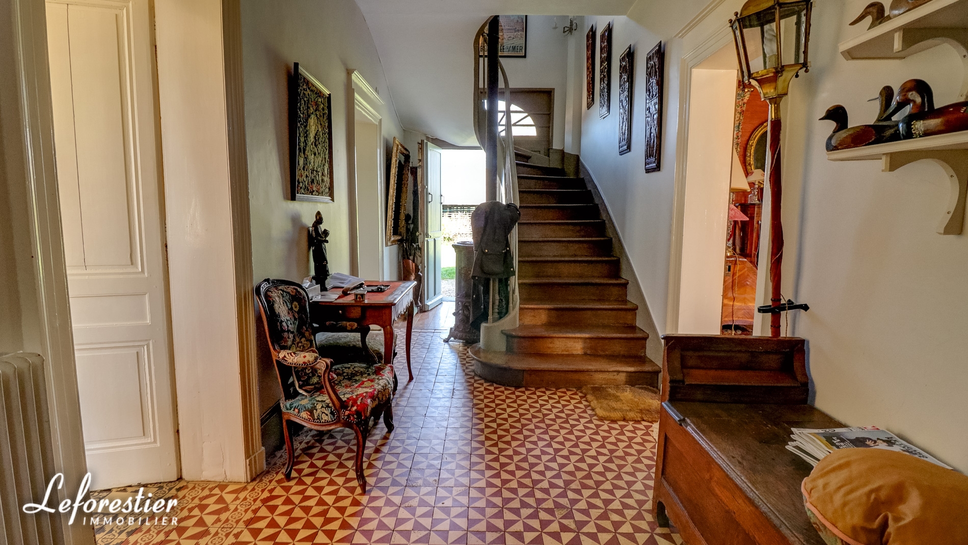 L’entrée centrale avec son bel escalier d’époque est dotée d’un authentique sol en carreau de ciment du meilleur effet. Le grand salon avec cheminée en marbre, parquet en chêne et boiseries accueille les invités dans une ambiance feutrée et conviviale, propice aux soirées réussies.