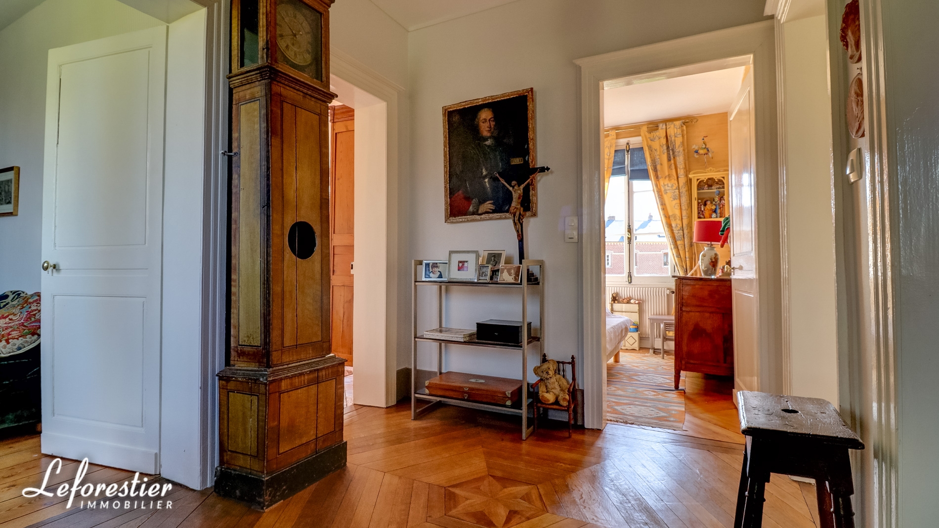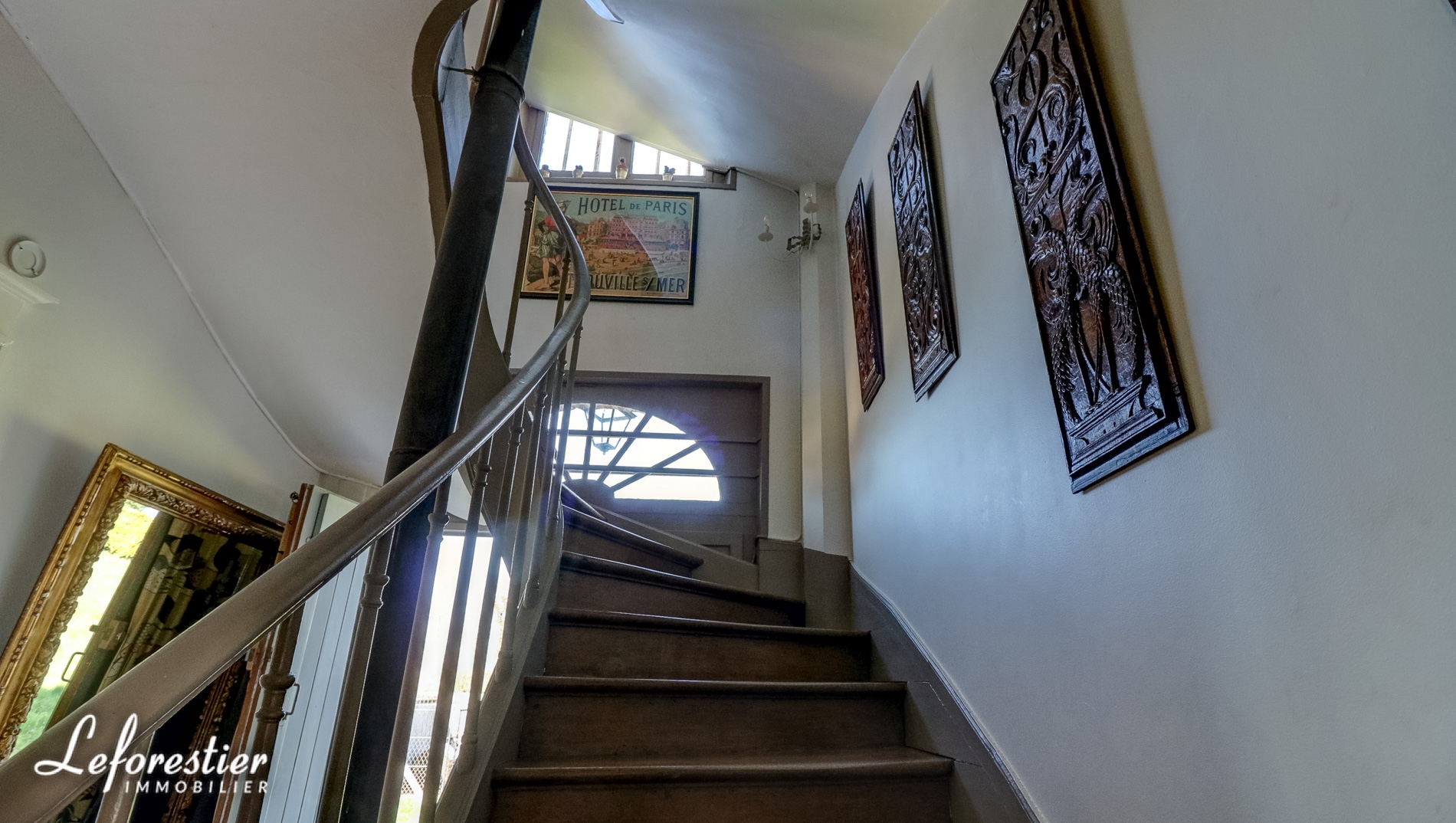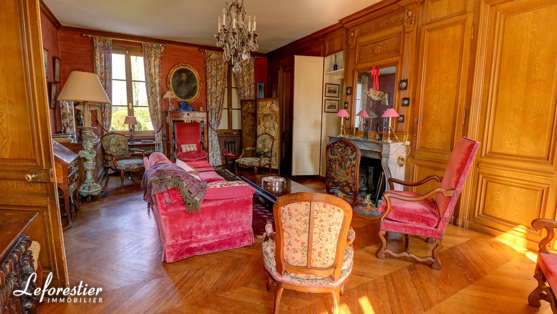 L’entrée centrale avec son bel escalier d’époque est dotée d’un authentique sol en carreau de ciment du meilleur effet. Le grand salon avec cheminée en marbre, parquet en chêne et boiseries accueille les invités dans une ambiance feutrée et conviviale, propice aux soirées réussies.