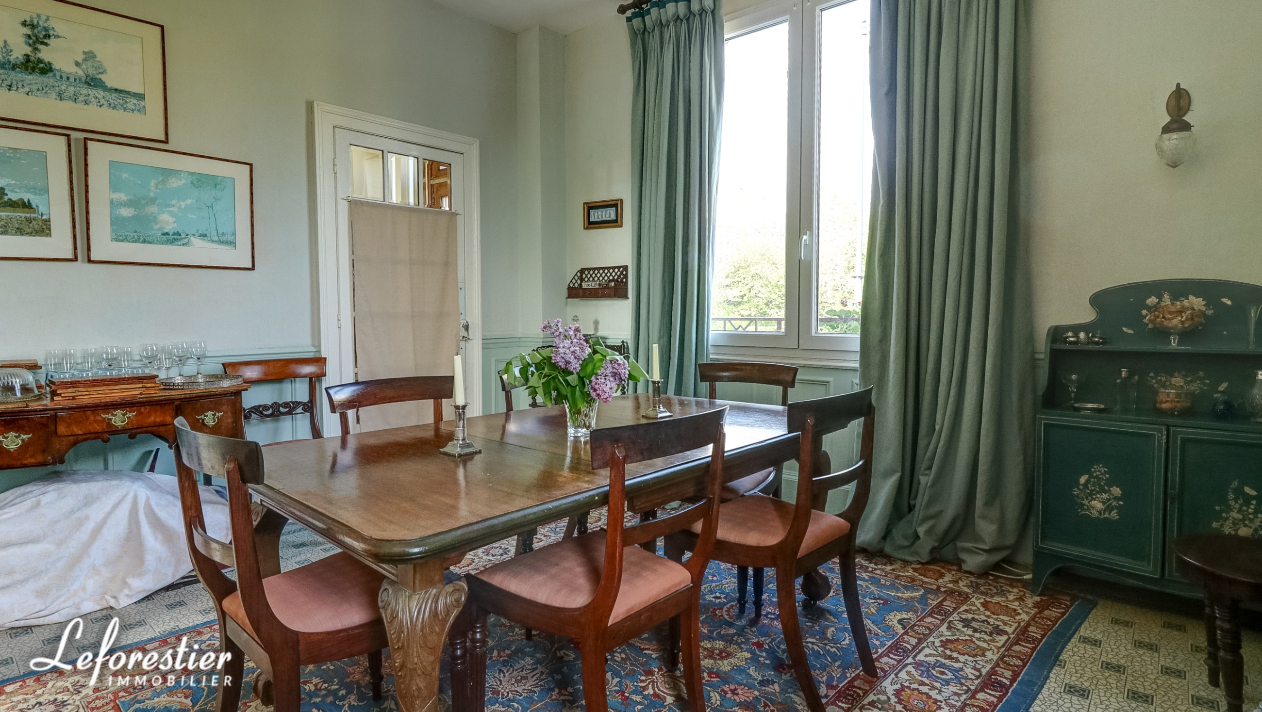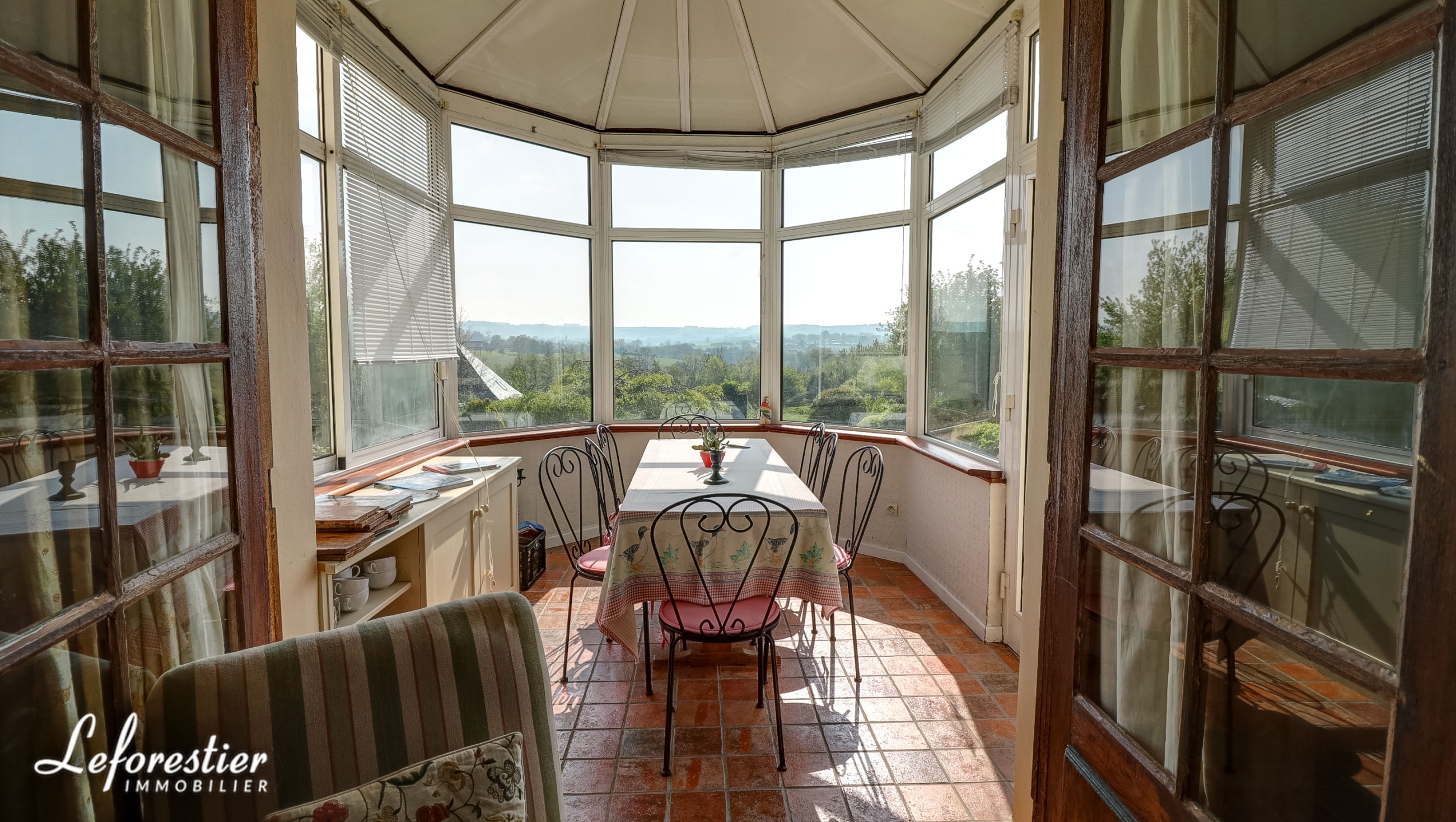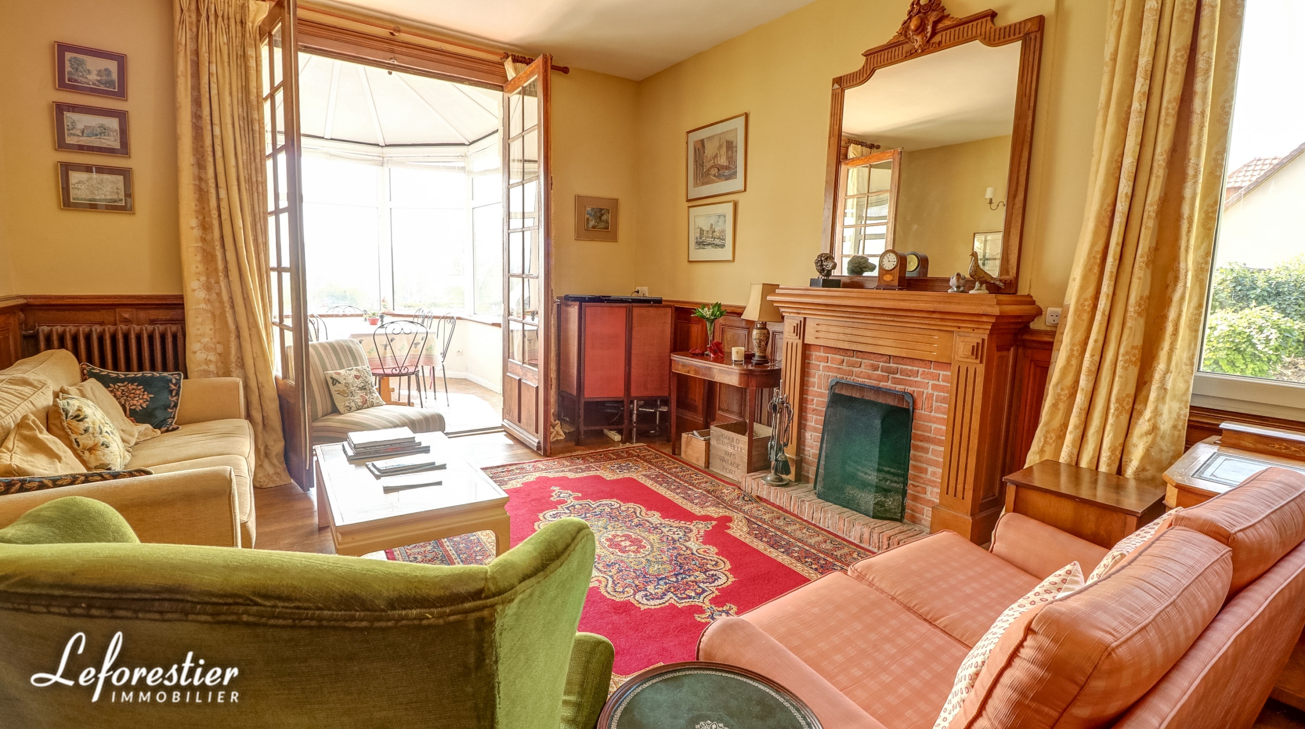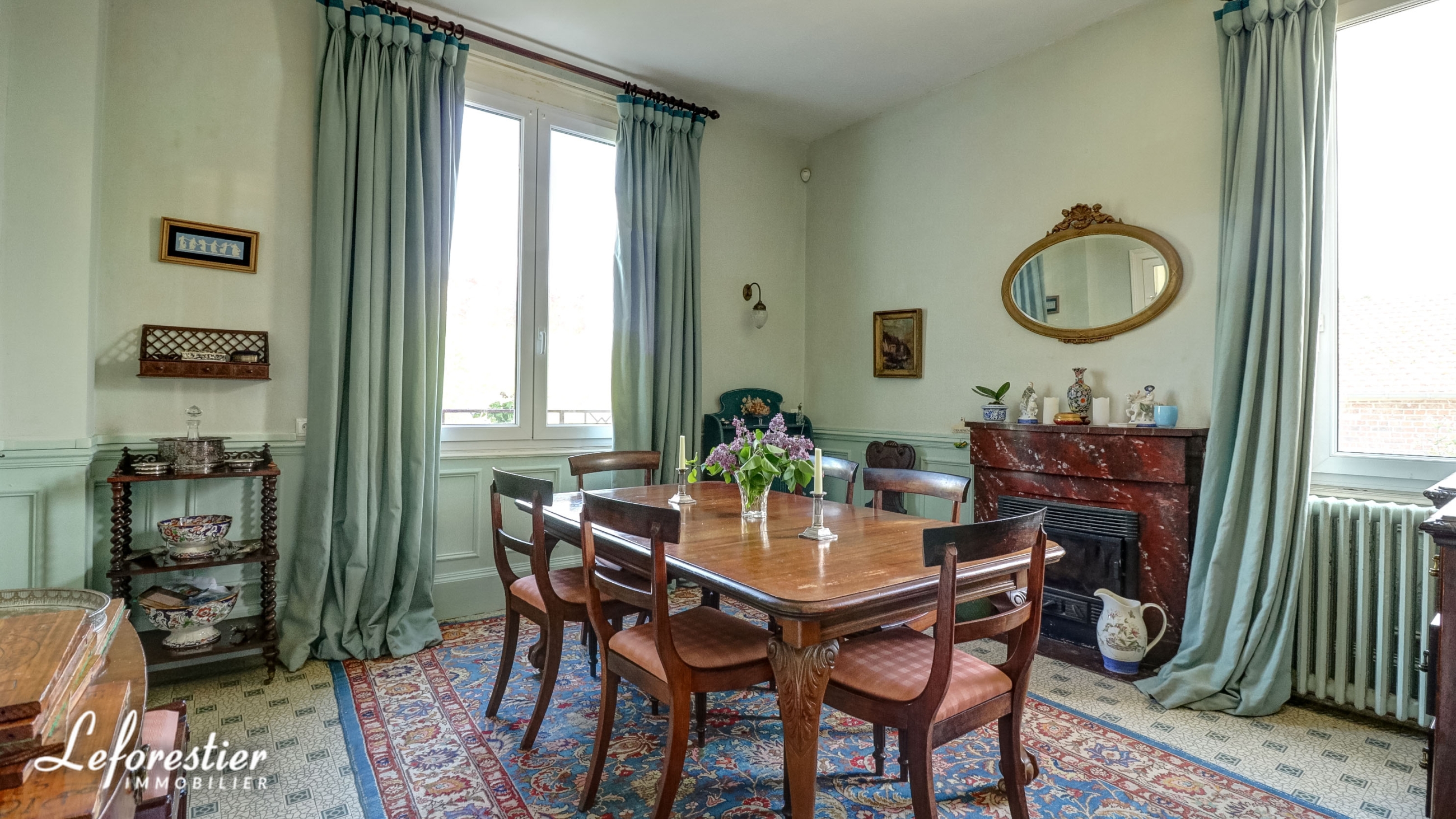 Cette grande maison normande, a conservé ses sols anciens, moulures, cheminées et boiseries. Au rez-de-chaussée, les pièces sont disposées de part et d’autre de l’entrée. Le salon se prolonge sur une véranda bowwindow qui permet de profiter du jardin même sous la pluie de Normandie ! La porte de la salle à manger s’ouvre sur une cuisine moderne, bien équipée pour cuisiner avec plaisir.