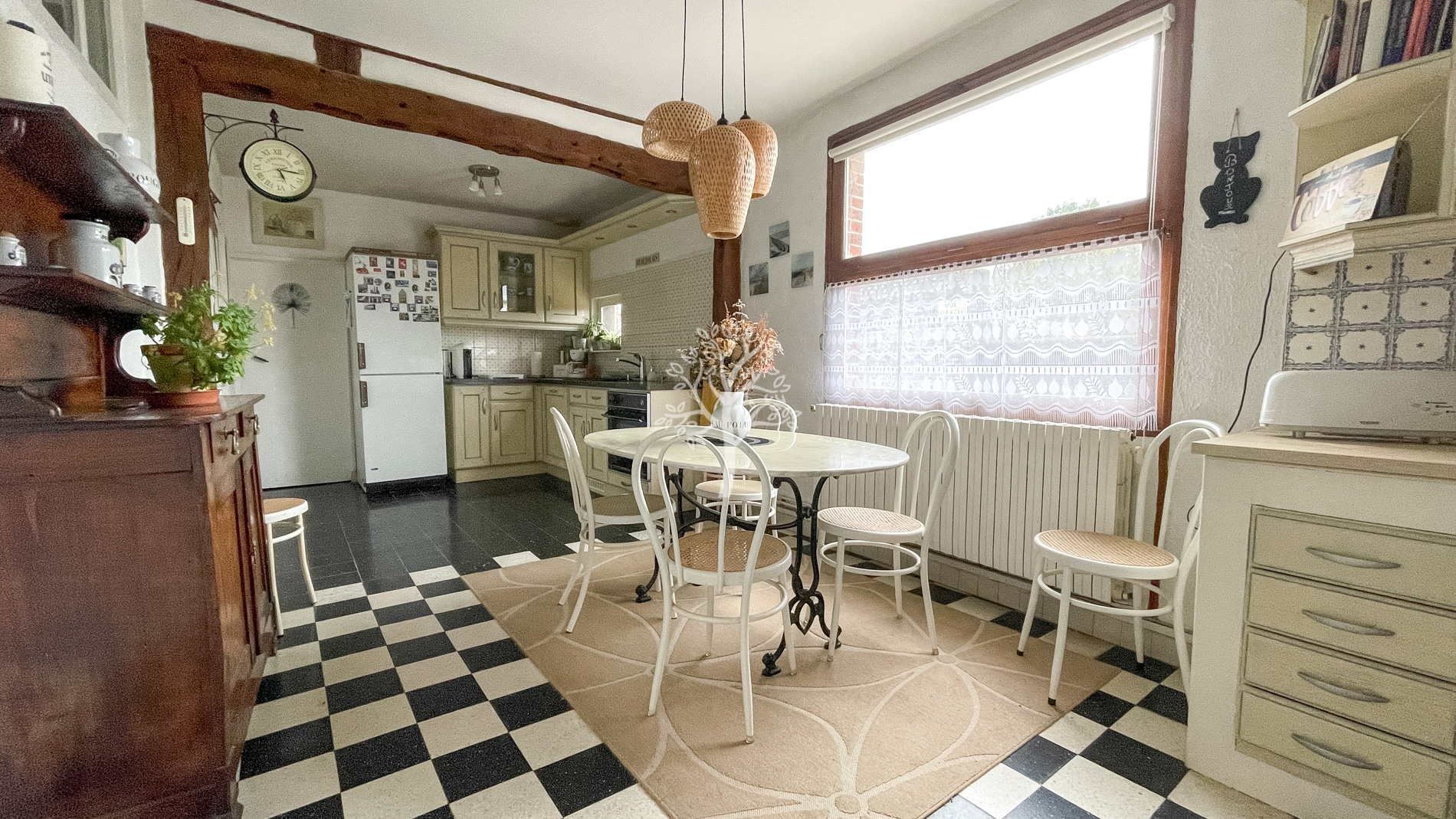 La distribution actuelle est faîte pour pouvoir utiliser indépendamment le rez-de-chaussée et les étages. Au rez-de-chaussée vous trouverez la salle à manger / salon, deux chambres, une verrière et une grande cuisine avec arrière-cuisine et buanderie. Les toilettes sont accessibles par l’extérieur. On peut aisément les intégrer en transformant la buanderie en salle de douche.