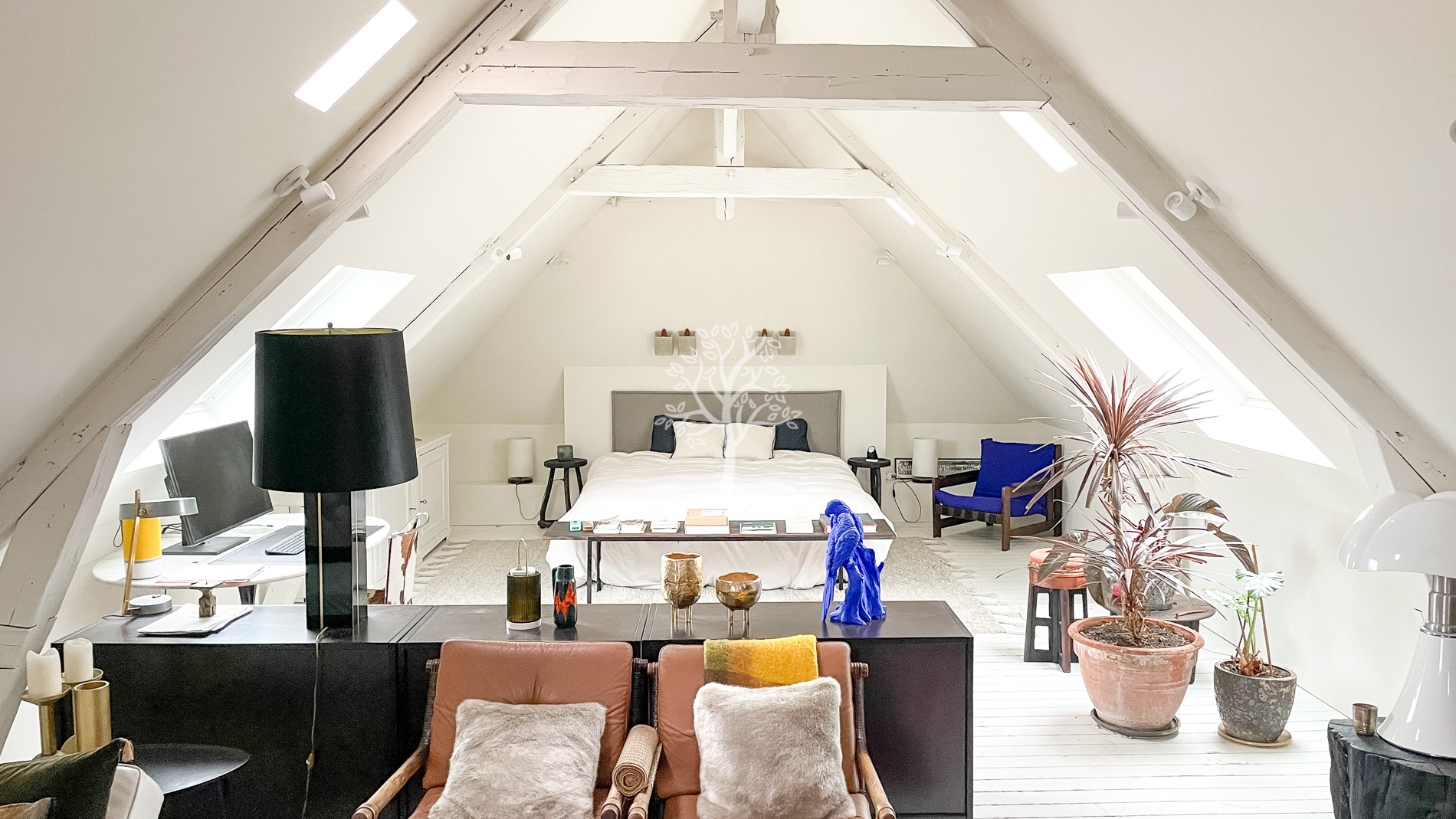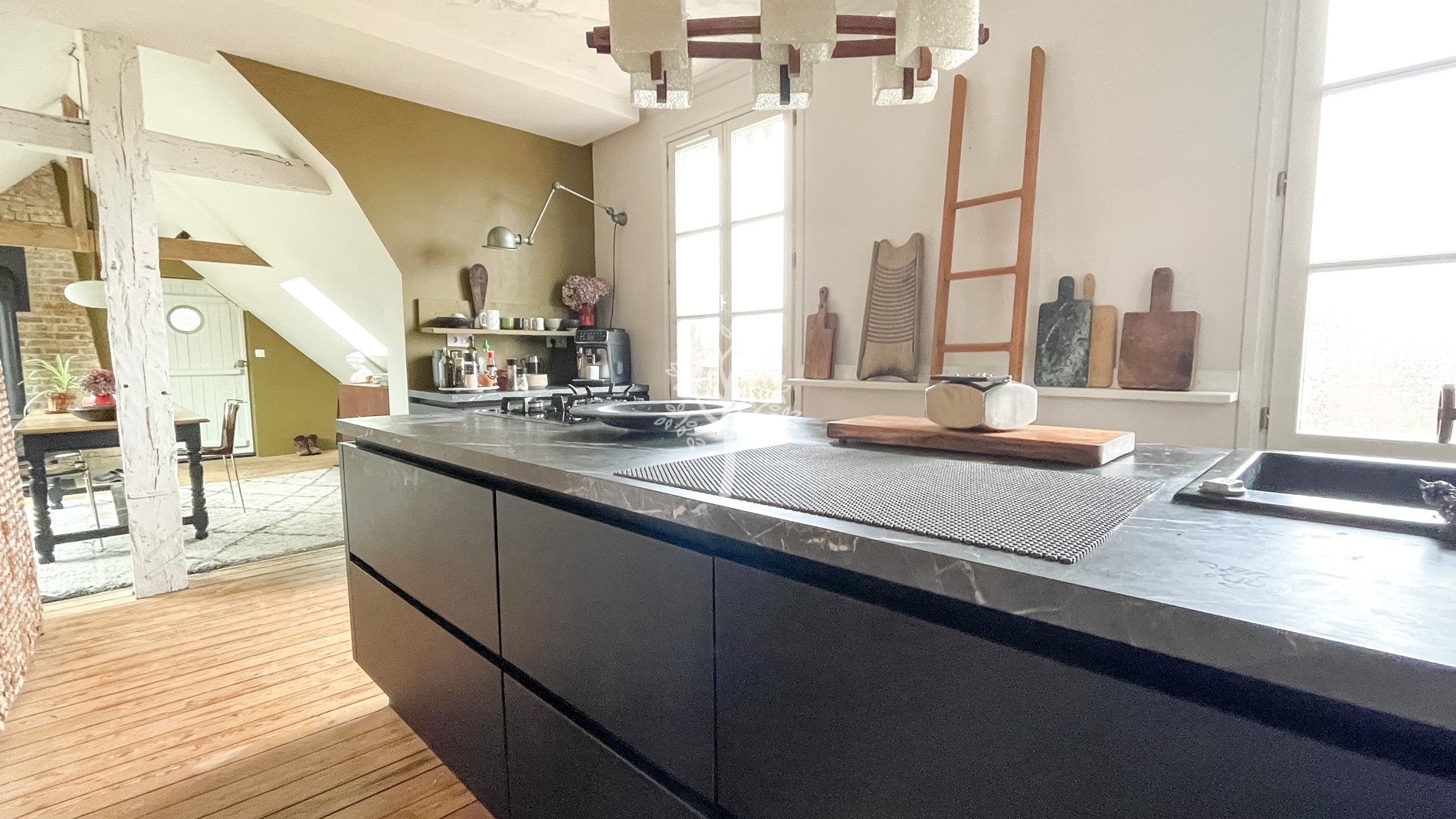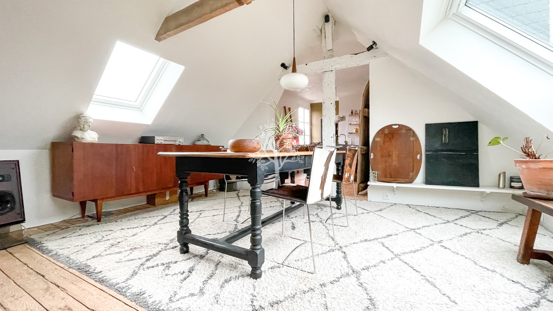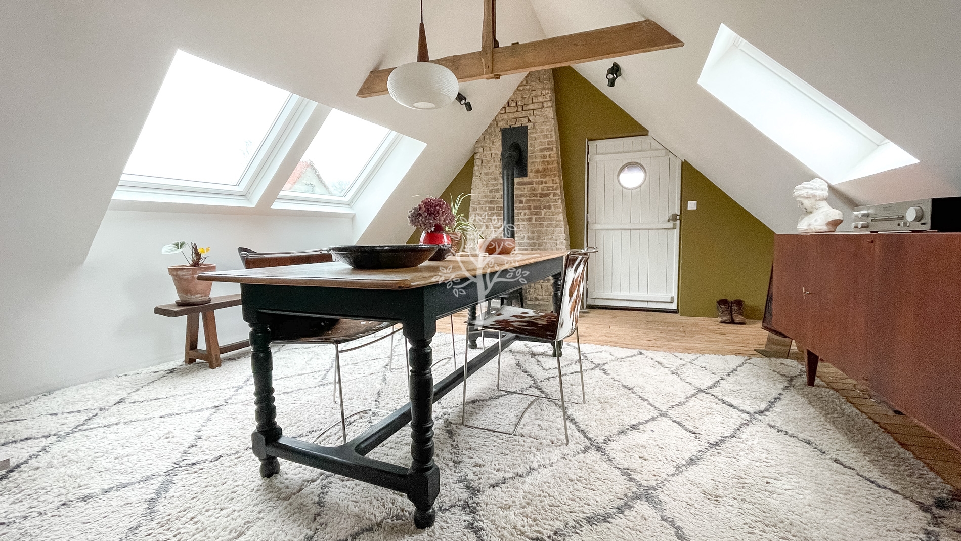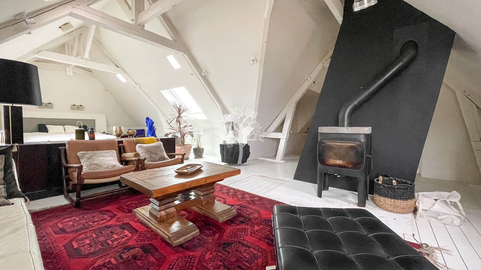 A l’étage, on entre dans un autre univers par une cuisine avec son grand plan de travail, une salle à manger, deux chambres avec salle de douche, des toilettes et une salle de bain. Ce niveau est accessible par l’intérieur mais aussi par l’extérieur via un escalier de meunier. Idéal pour un achat pour deux familles qui souhaiteraient acheter en commun ou pour des projets de location saisonnière. Enfin, au deuxième étage, se trouve un grand loft avec une partie dressing, salon avec un magnifique poêle à bois et une partie chambre / bureau. Cet espace est baigné de lumière !