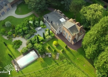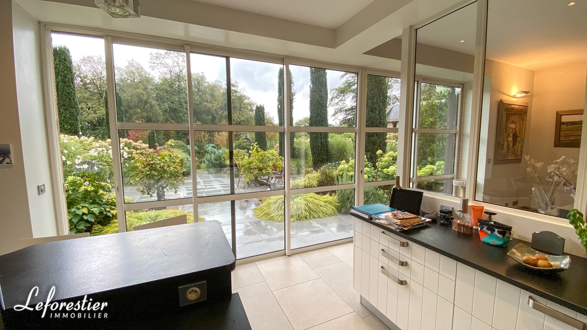 Dès le chemin d’accès entre deux rangées de hêtres bicentenaires, le décor est planté. Nichée dans une enceinte clos de murs de brique et de silex, la bâtisse ancienne apparaît. Entouré de bois, le parc a été enrichi de nombreux arbres et massifs. L’ancienne bâtisse de style « maison de Maitre » du Pays de Caux à la distribution classique est réservée aux enfants et amis. L’ancienne dépendance attenante est aujourd’hui totalement transformée en pièces de vie baignées de lumière. La toiture en voute de cuivre est très élégante. L’architecte a profité de ce volume pour optimiser les espaces disponibles et créer des pièces de réception conviviales et à taille humaine. La cuisine et la salle à manger disposent de hautes baies ouvrant vers la terrasse et la piscine. A l’étage de cette partie, l’appartement de nuit des propriétaires aux allures de loft se décline en un salon intime, deux bureaux, une très grande chambre, un dressing et une spacieuse salle de bains.