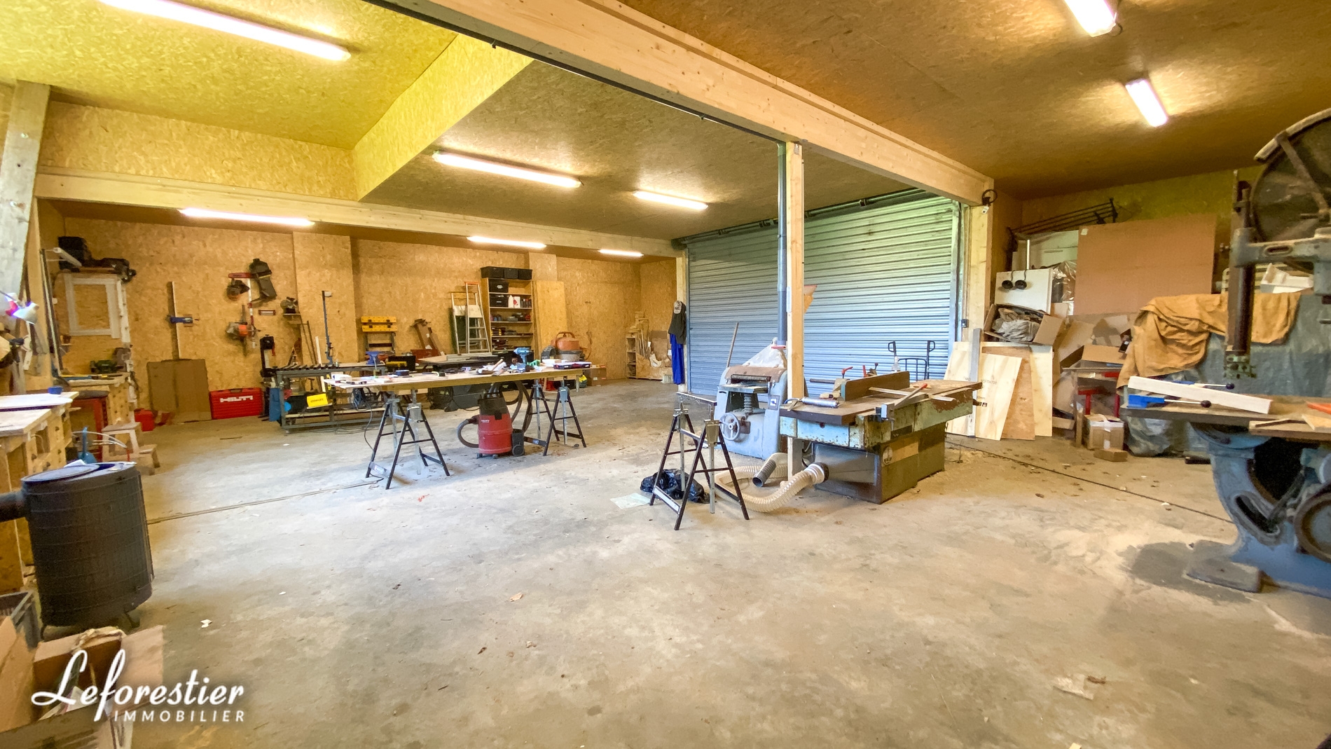 Ce grand hangar agricole à l’origine est divisé en 3 espaces. Un espace de rangement de matériel d’entretien, tracteur et autres machines, un espace de stockage de bois et un espace qui vient d’être créé, un grand atelier ! Pour un collectionneur de voitures anciennes, Il est équipé d’un volet roulant électrique et peut facilement abriter tous types de véhicules en toute sécurité. Comme dans tous les bâtiments, les réseaux électrique et d’eau sont présents. Le lieu est clos et peut être chauffée l’hiver. La toiture a été totalement reprise et renforcée en 2015 sur les 600m2 de toiture, tout en ardoise naturelle.