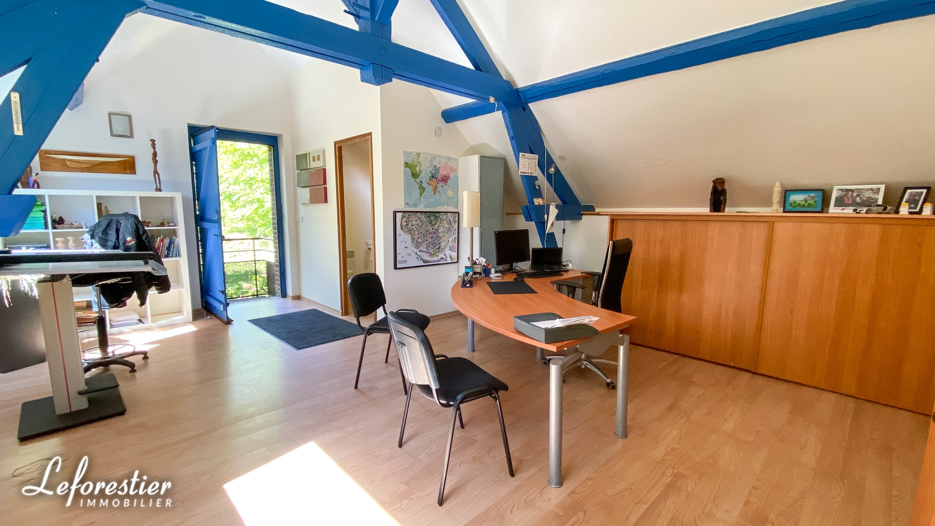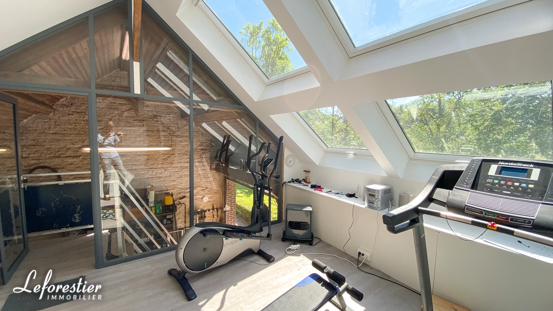 Cette ancienne écurie a été aménagée en atelier au RDC et en bureau à l’étage. A l’image des autres dépendances, elle a bénéficié d’une restauration quasi-complète. Les deux portes de garages automatiques permettent de loger deux grands véhicules. Une mezzanine en structure verre et métal accueille un espace « salle de sport ».