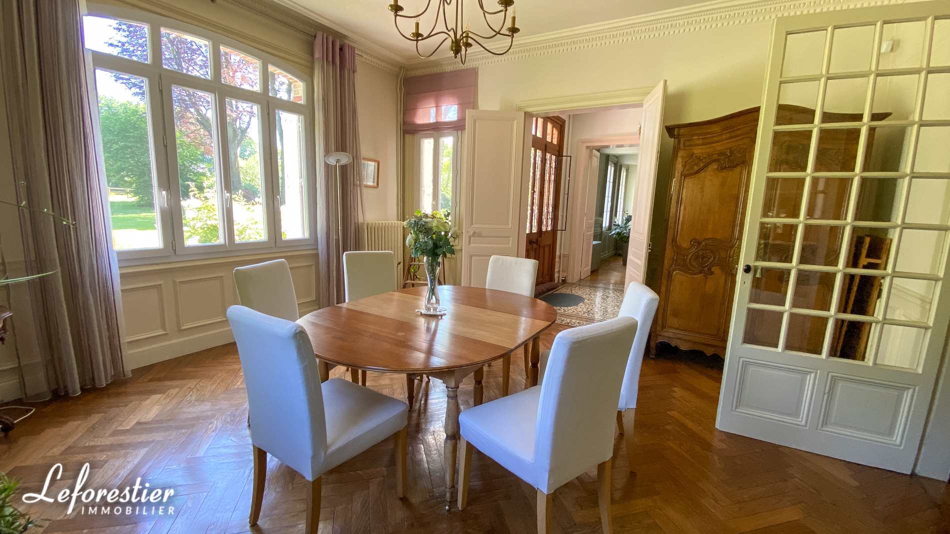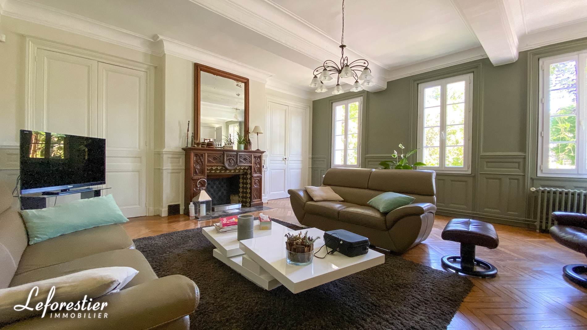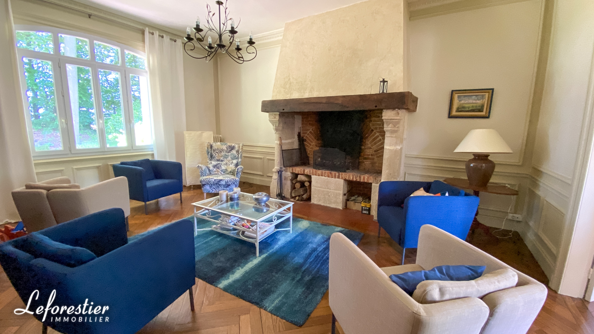 Construite sur plusieurs époques, cette bâtisse a très probablement été initialement construite au 17ème siècle. Par la suite, une tourelle est venue se greffer au corps central, pratique courante chez les bourgeois prospère du 19ème siècle. Cette demeure vous accueille avec sa majestueuse entrée et son bel escalier en chêne. Le grand salon, la salle à manger et le petit salon sont dotés de magnifiques cheminées. Ces espaces de vie sont les pièces maîtresses de cette demeure.
