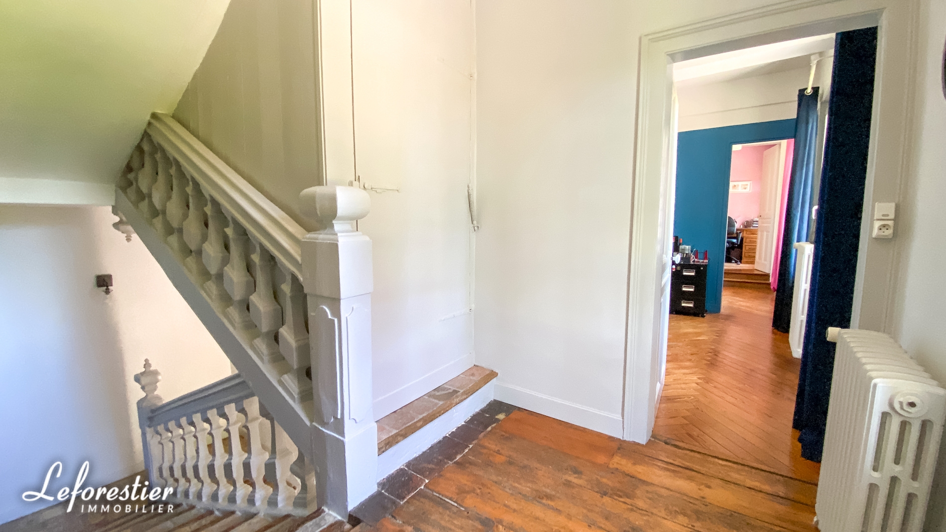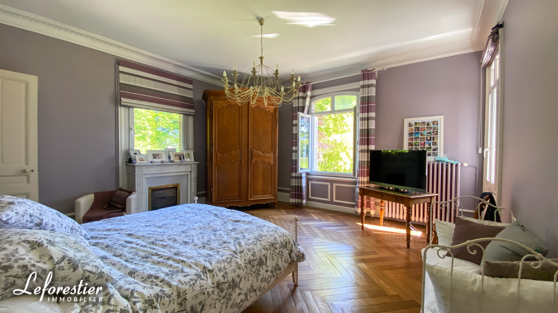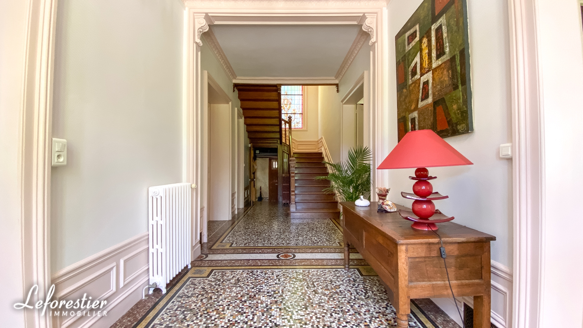 Construite sur plusieurs époques, cette bâtisse a très probablement été initialement construite au 17ème siècle. Par la suite, une tourelle est venue se greffer au corps central, pratique courante chez les bourgeois prospère du 19ème siècle. Cette demeure vous accueille avec sa majestueuse entrée et son bel escalier en chêne. Le grand salon, la salle à manger et le petit salon sont dotés de magnifiques cheminées. Ces espaces de vie sont les pièces maîtresses de cette demeure.