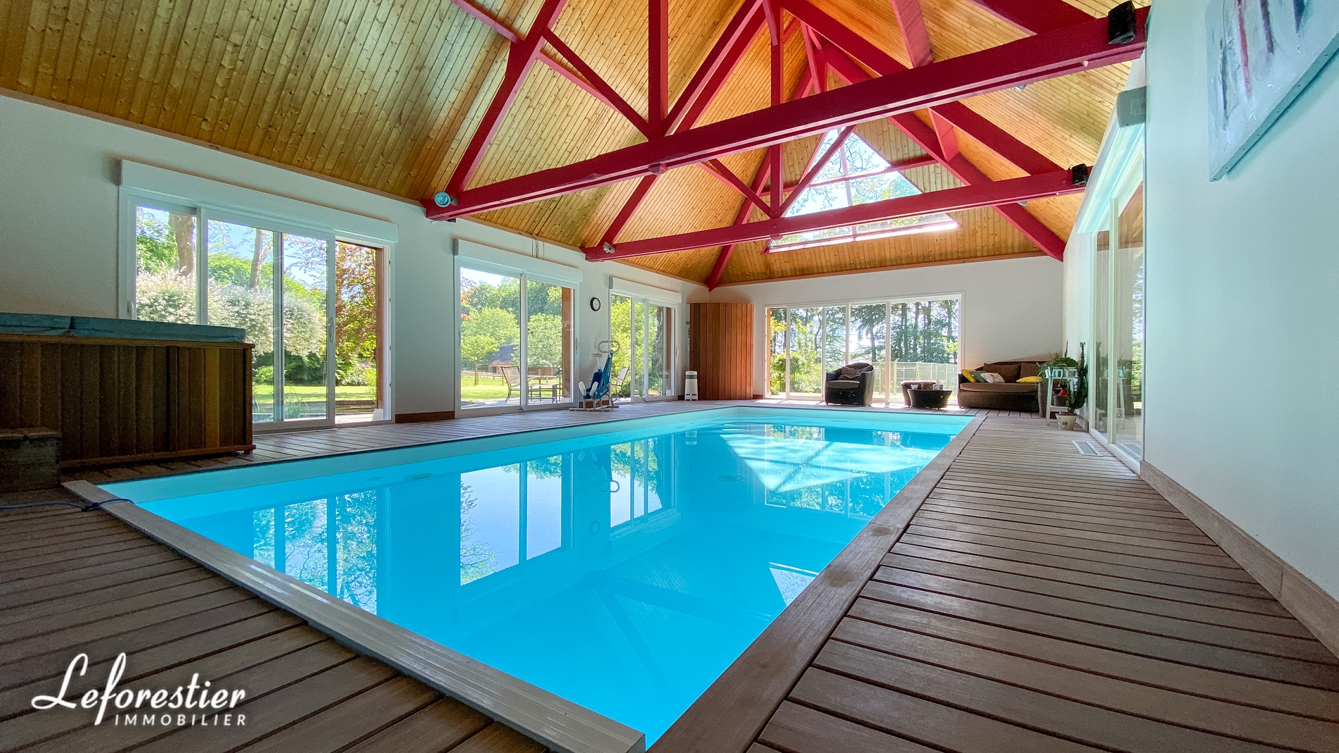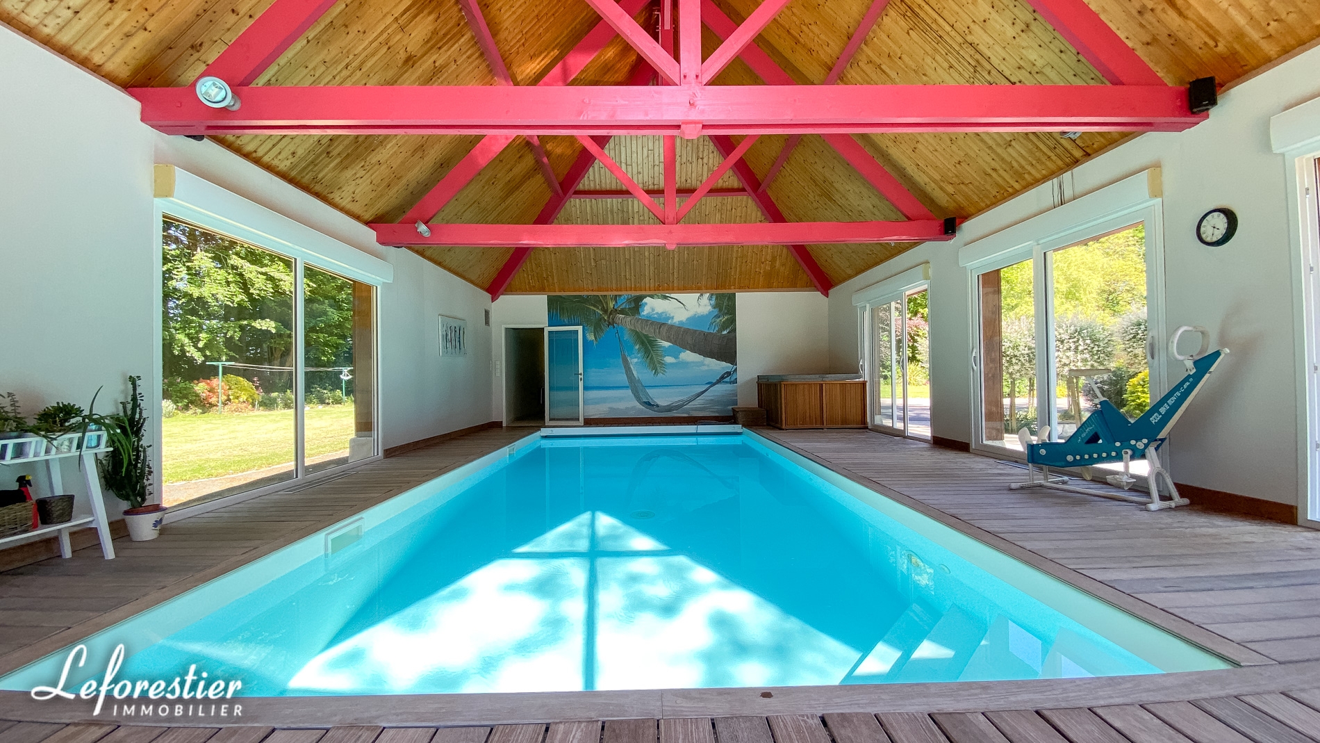 Dans la partie la plus récente, vous trouverez un petit garage, un cabinet de toilette et surtout une piscine d’intérieur de 8m x 4m. Chauffée par une pompe à chaleur utilisant la géothermie, traitée au sel, déshumidifiée par un système performant et équipée, d’un volet roulant immergé électrique, cette piscine est « haut de gamme » pour un coût d’entretien tout à fait raisonnable grâce à ces équipements de qualité.