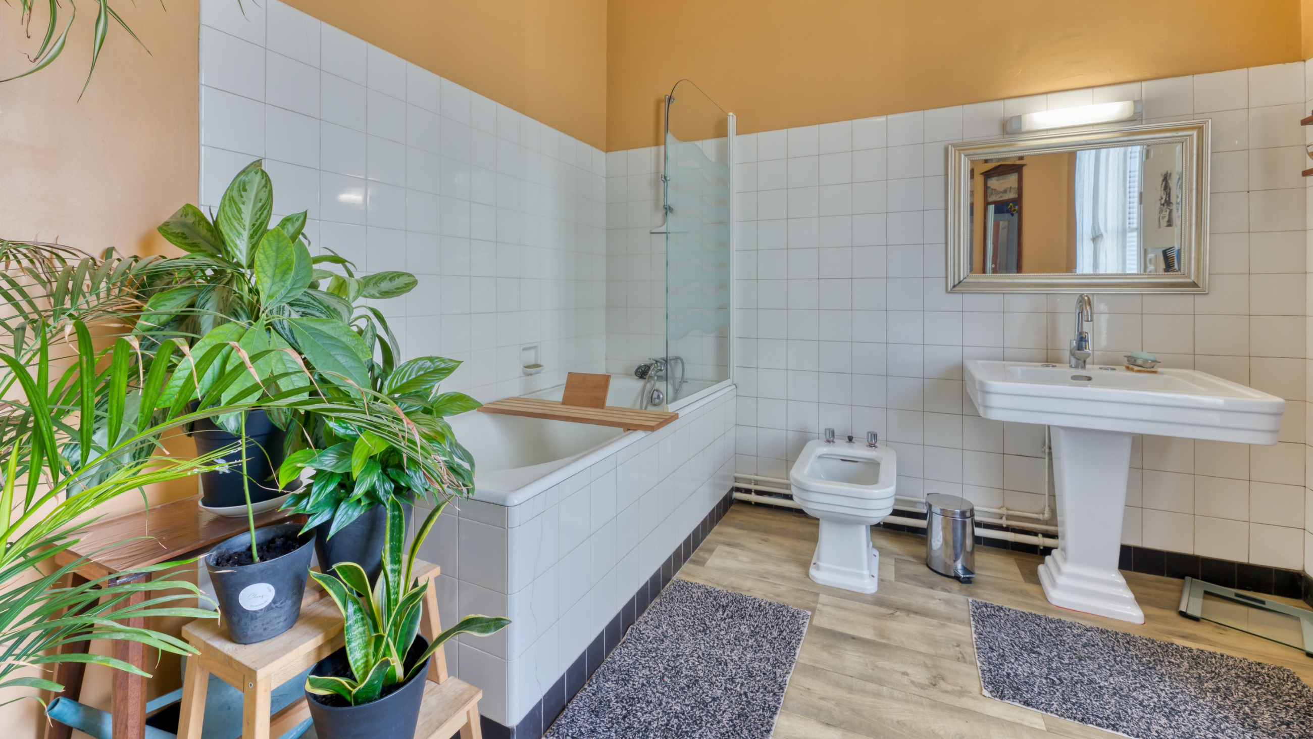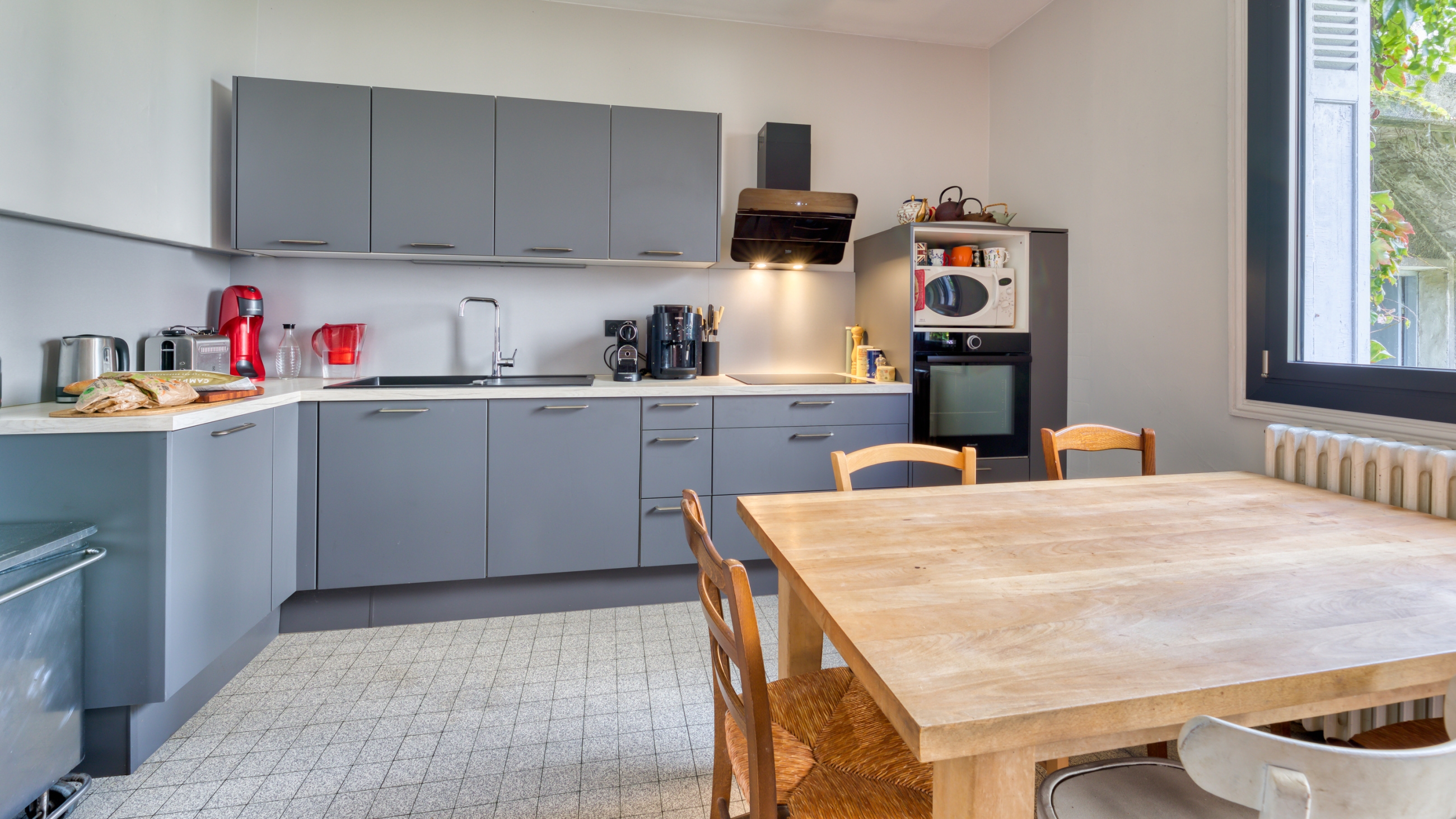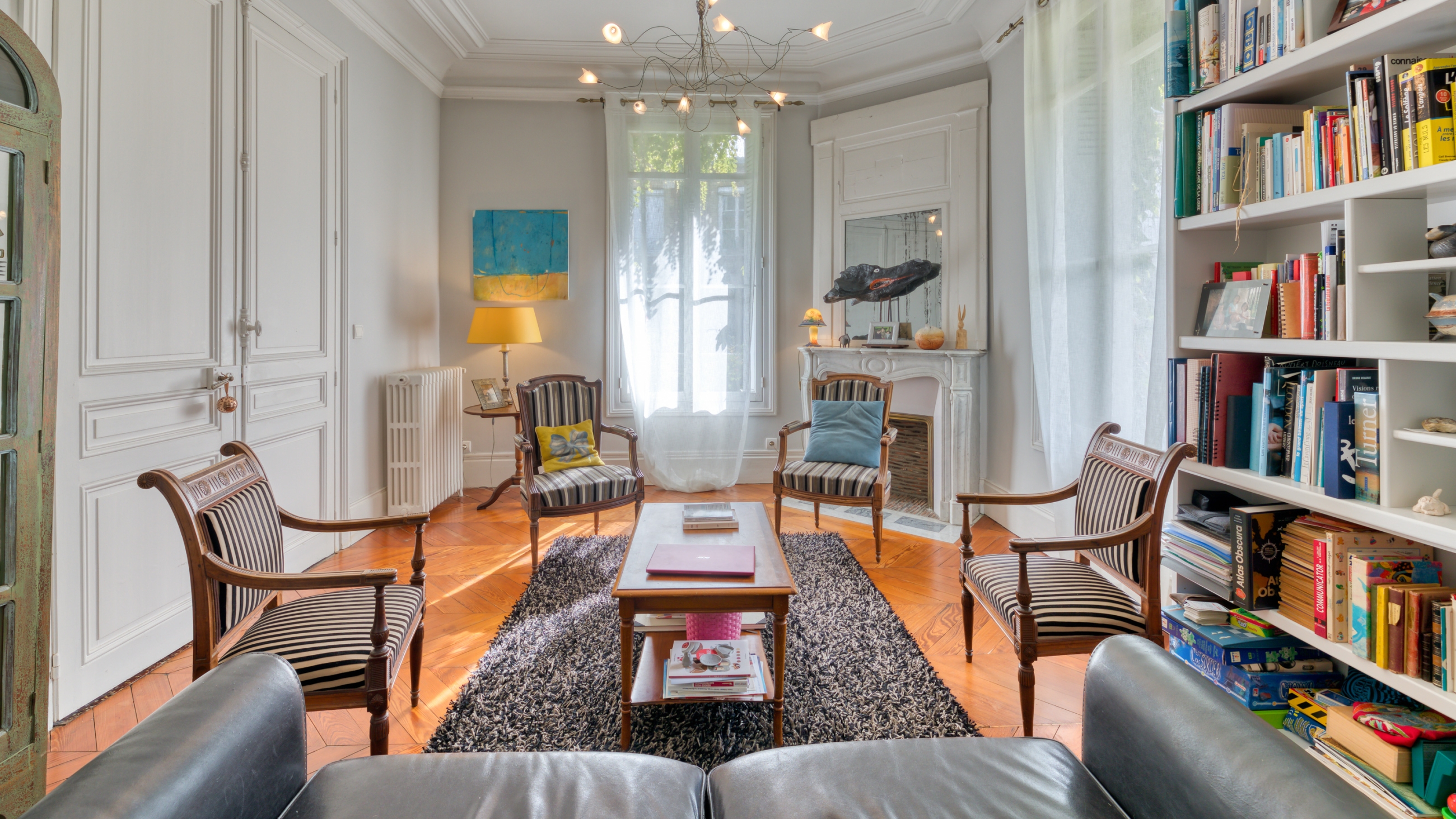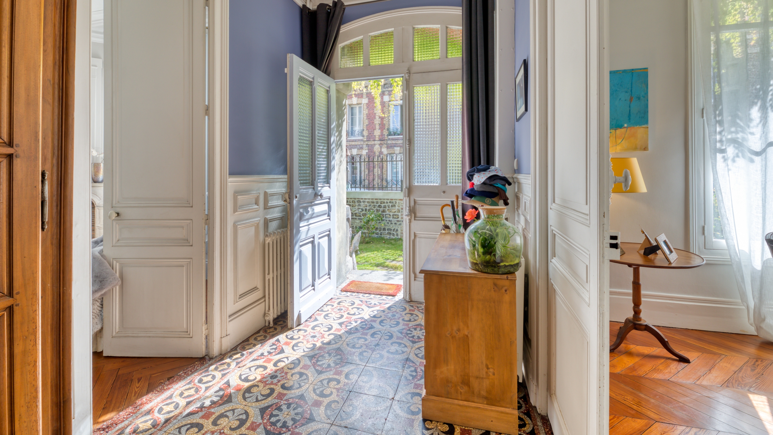 L’entrée centrale avec ses carreaux de ciment est typique des maisons bourgeoises du siècle dernier ! Le rez-de-chaussée avec parquet offre de belles réceptions : un grand salon avec cheminée exposé sud-ouest pour profiter des lumières de la fin de journée. Un autre salon avec cheminée offrant une exposition sud-est est aménagé en salon cosy avec télévision. Rénovée récemment la cuisine plus contemporaine accueille un coin repas. Pour les grandes tablées, la famille a installé une grande salle à manger en rez de jardin de la dépendance en briques attenante à la demeure. L’imposante cheminée crée une atmosphère campagnarde en ville ! Dégagements, arrière-cuisine, buanderie facilitent la vie de la famille en rez de jardin.