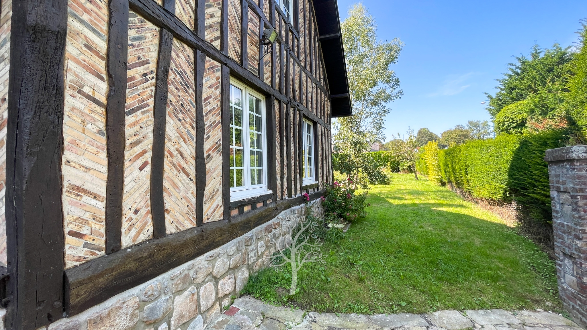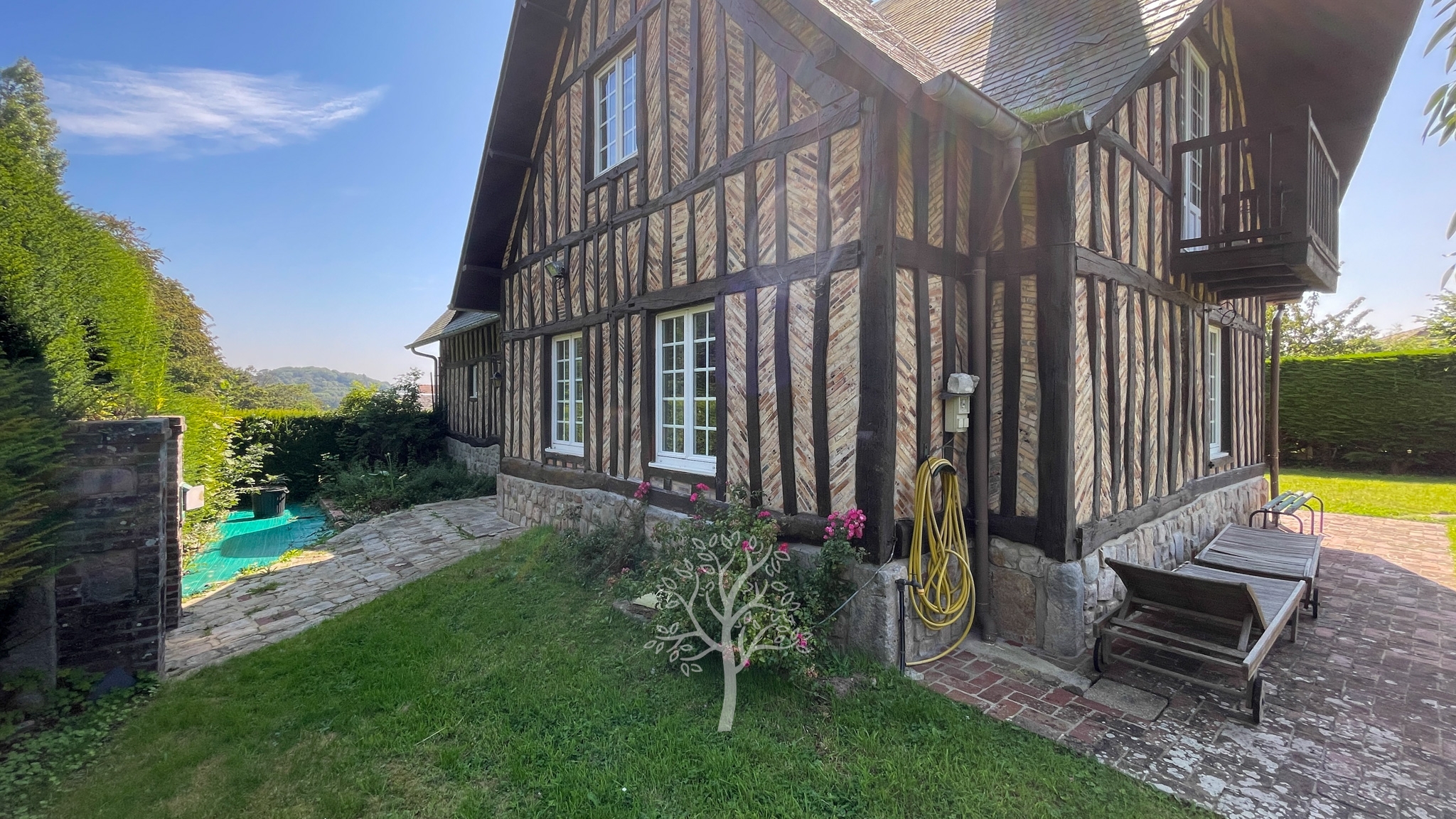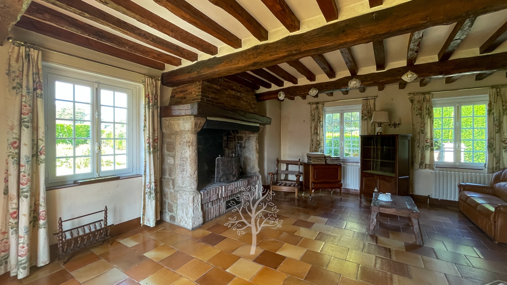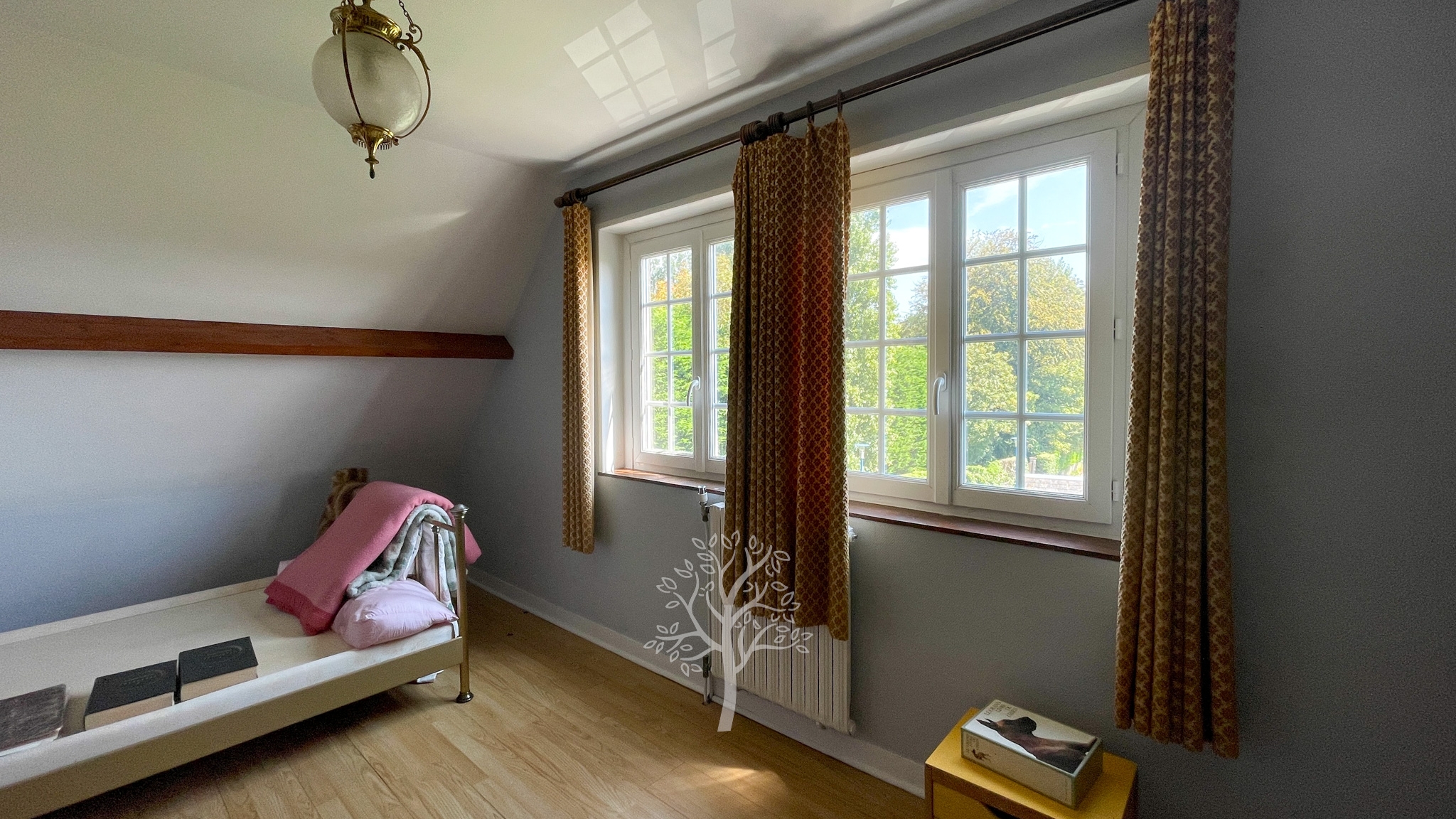Cette maison de style néo-normand est une solide bâtisse datant du début des années 1970. Son propriétaire a eu la volonté de la construire avec des éléments naturels présents dans la région. Soubassements en grès, poutres en bois de chêne.