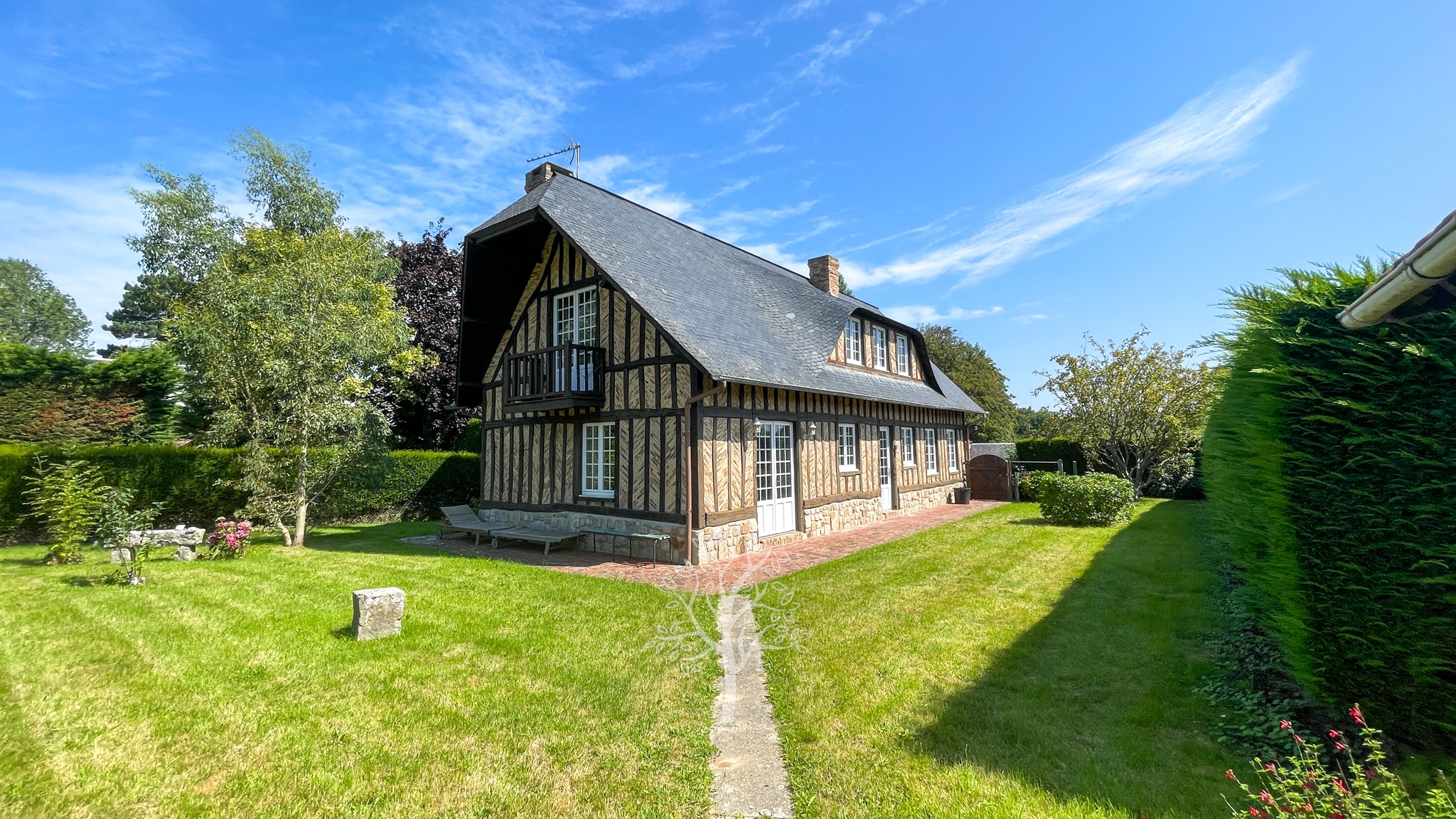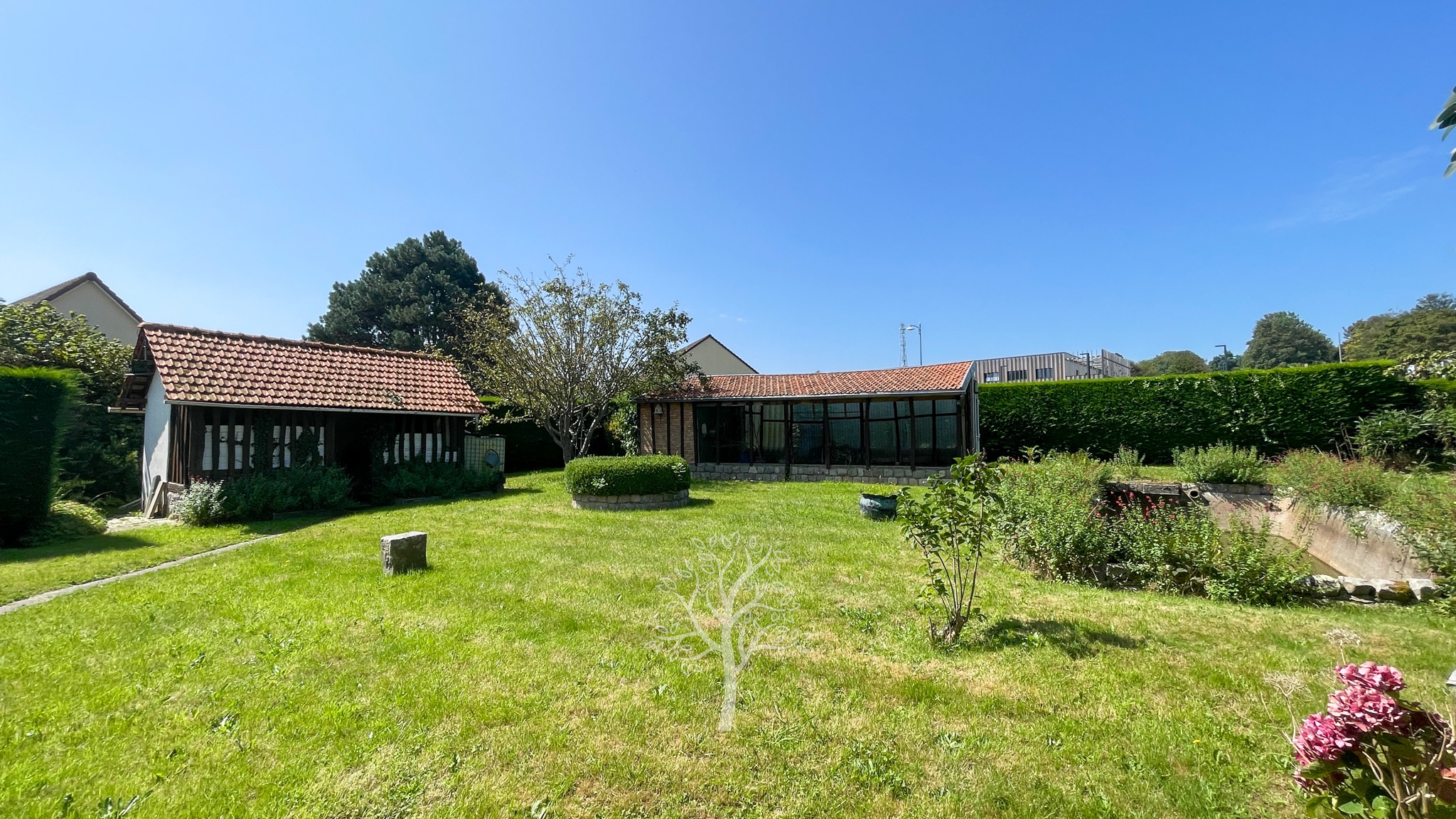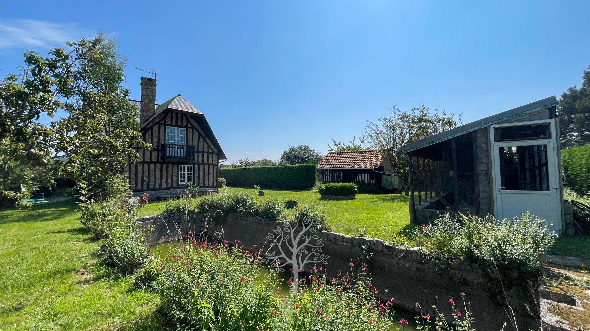 Cette maison de style néo-normand est une solide bâtisse datant du début des années 1970. Son propriétaire a eu la volonté de la construire avec des éléments naturels présents dans la région. Soubassements en grès, poutres en bois de chêne.
