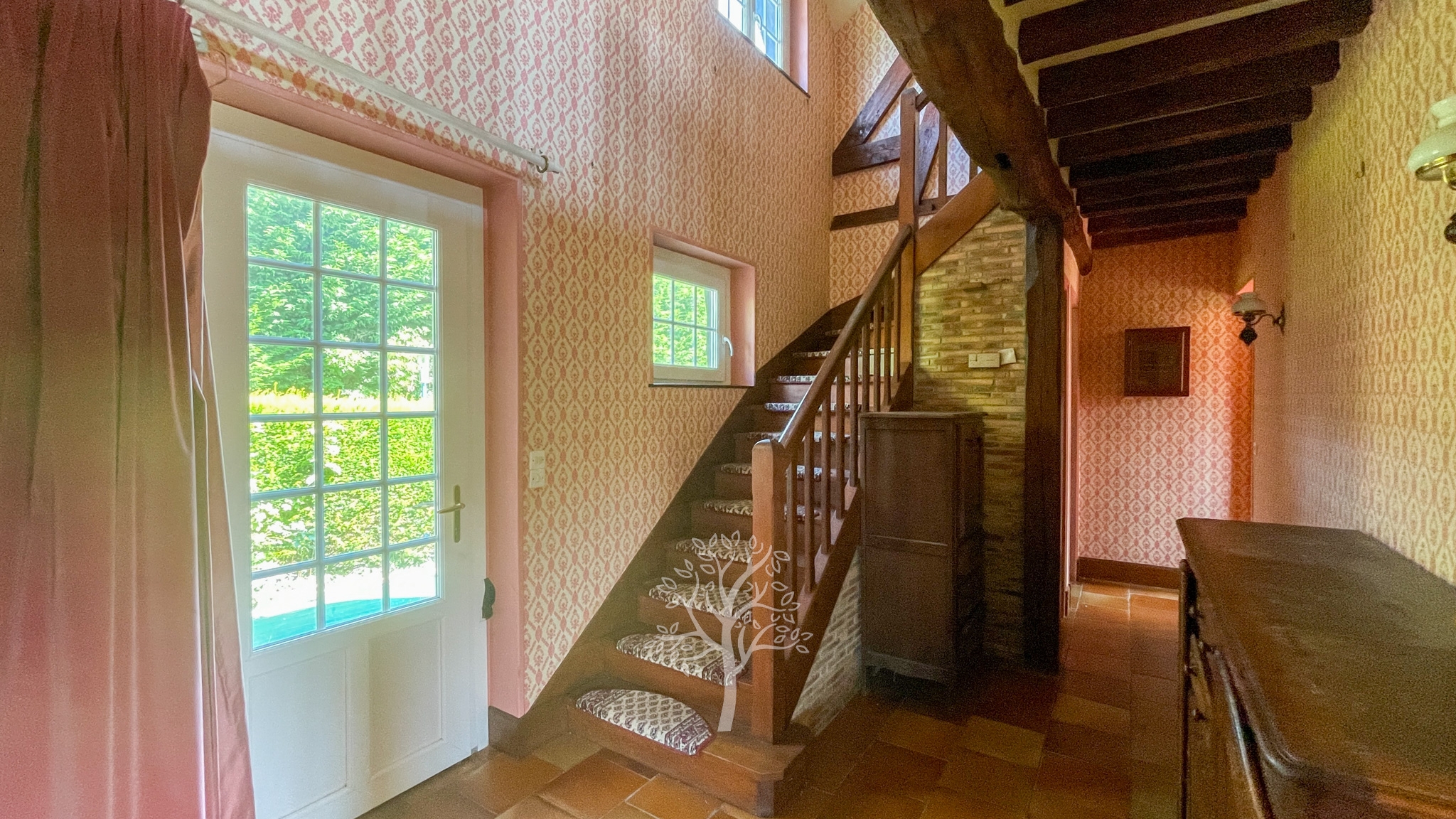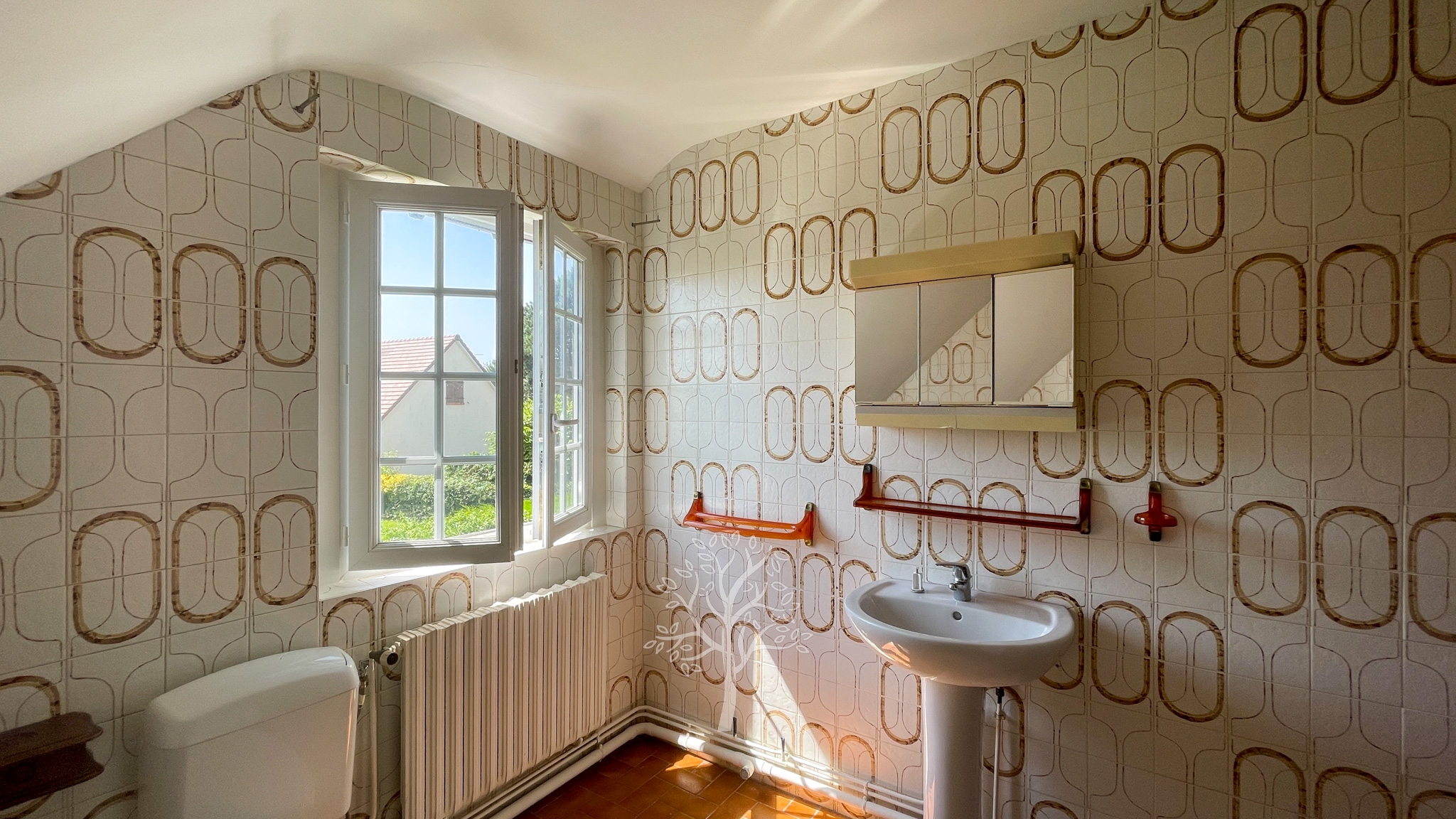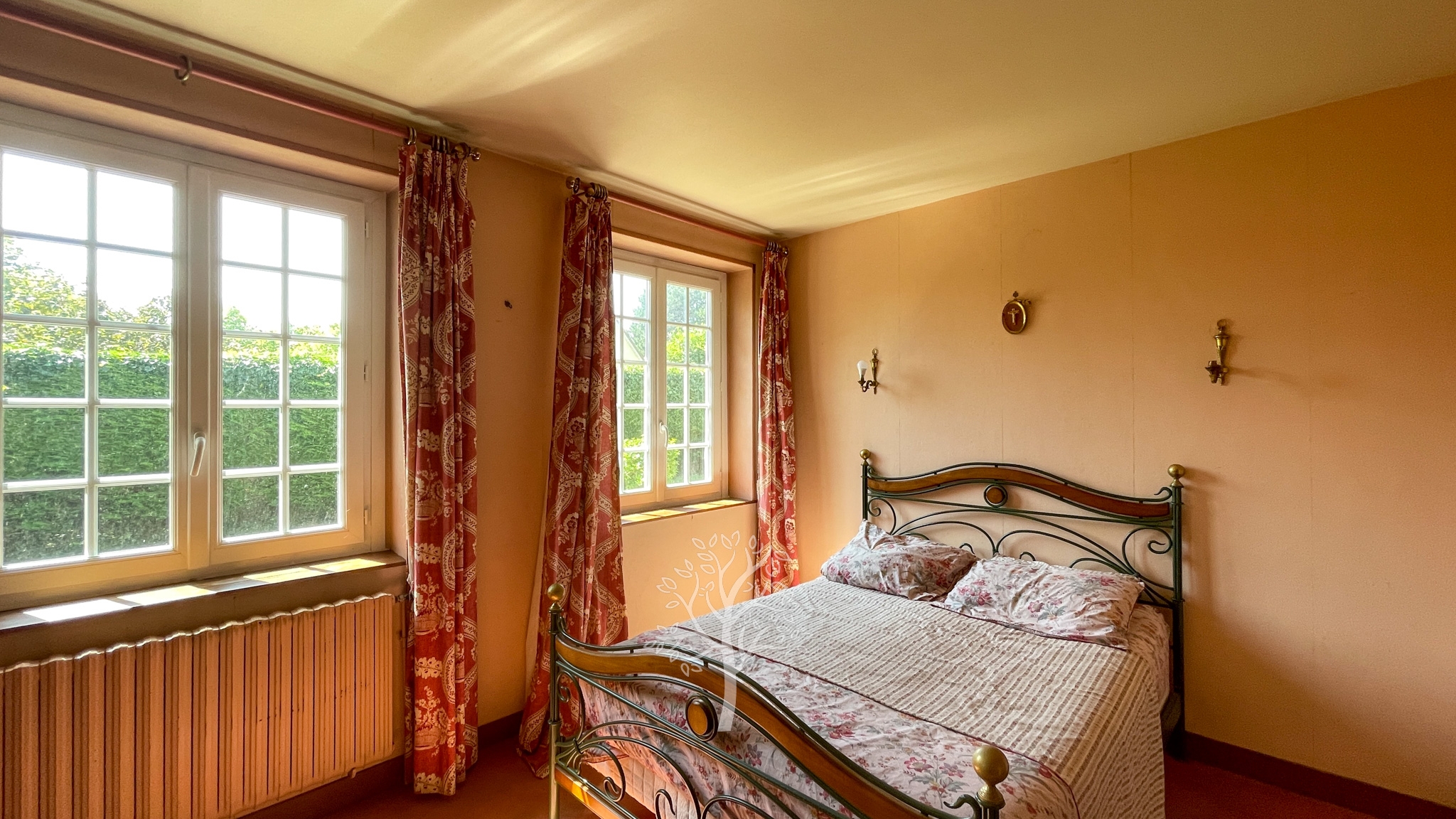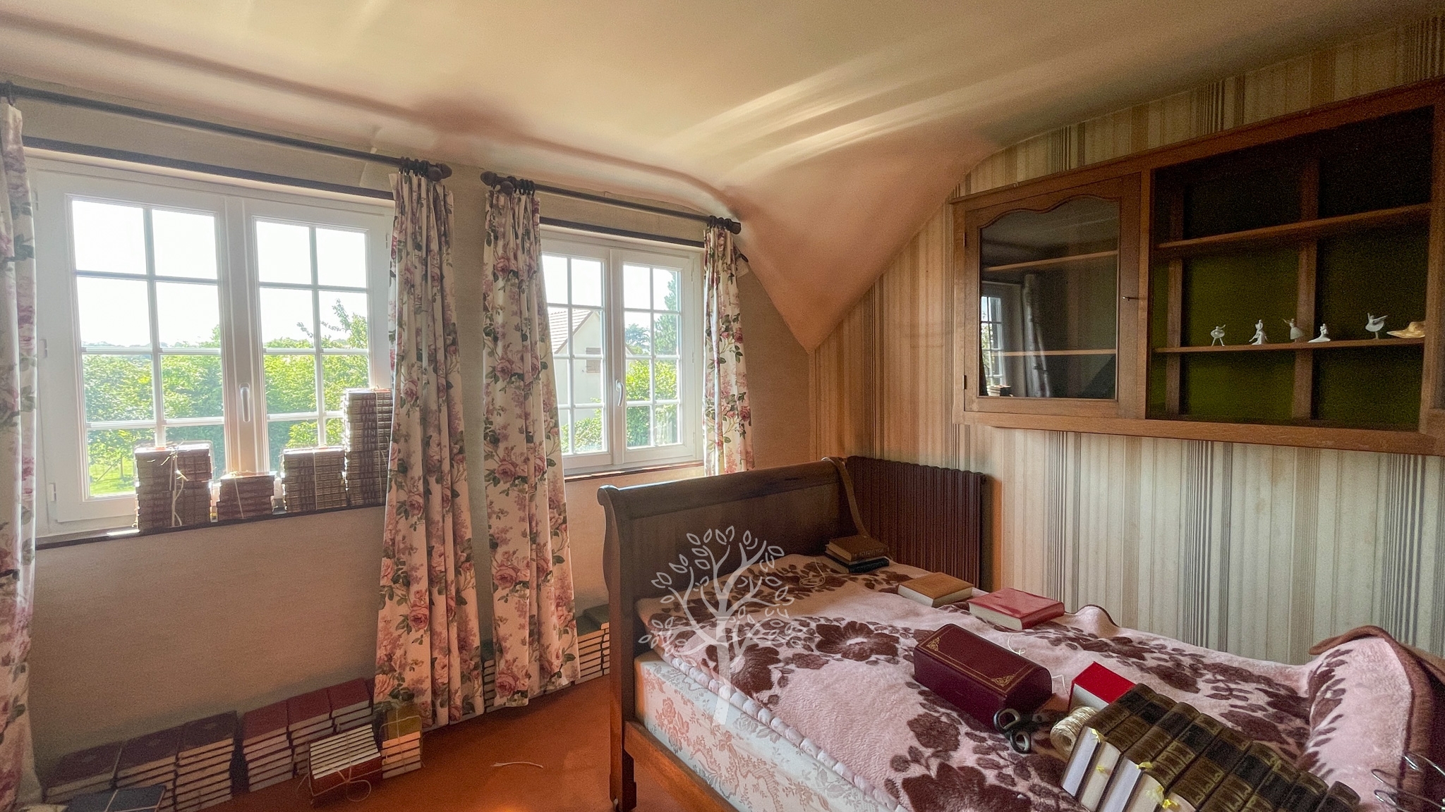Cette maison de style néo-normand est une solide bâtisse datant du début des années 1970. Son propriétaire a eu la volonté de la construire avec des éléments naturels présents dans la région. Soubassements en grès, poutres en bois de chêne.